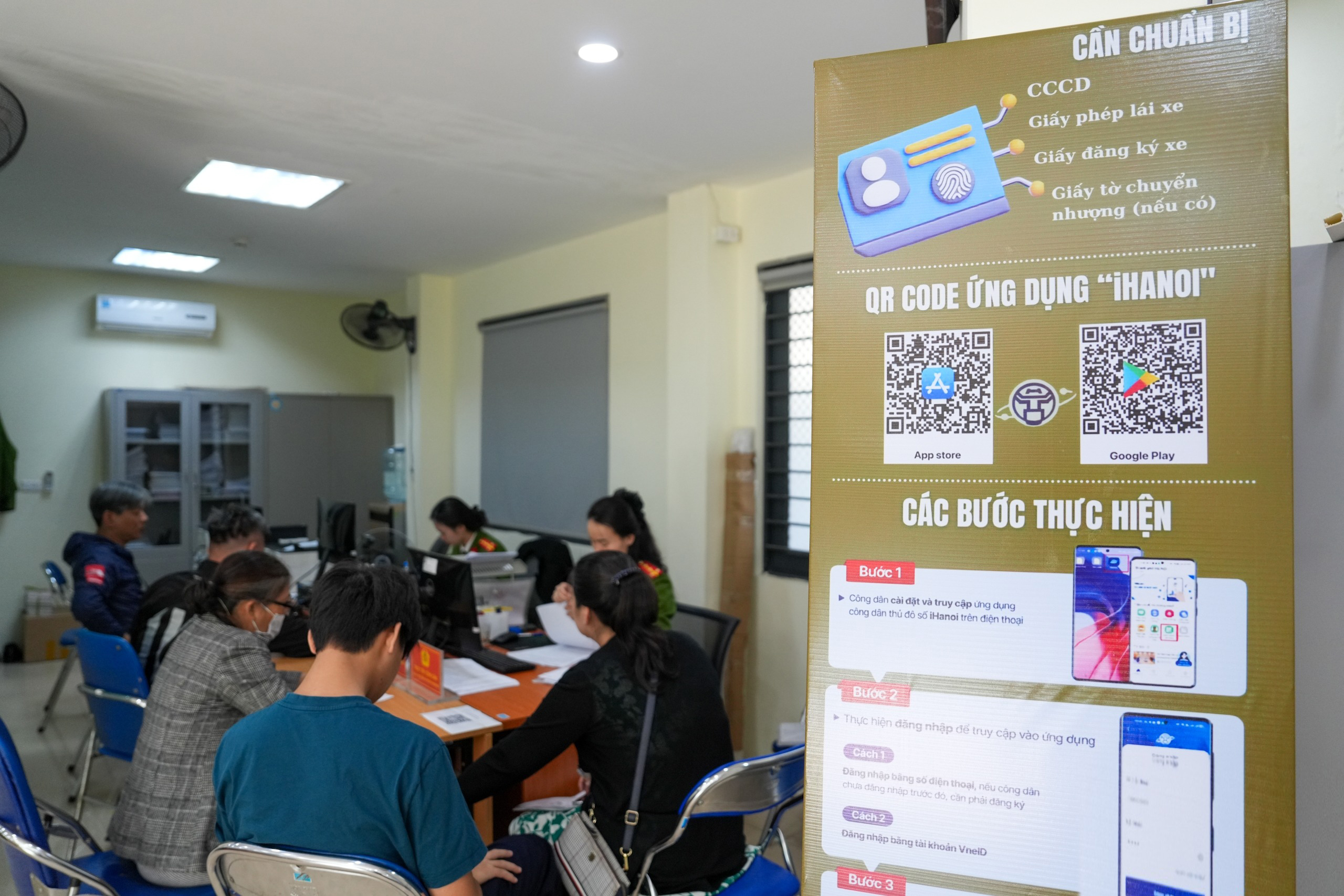 Các chiến sĩ hướng dẫn người dân cài đặt iHanoi, giải thích rõ việc không kê khai có thể khiến phương tiện bị cập nhật trạng thái “Xe không hoạt động”