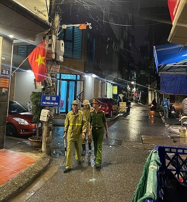 Cán bộ Công an phường Láng cùng lực lượng bảo vệ an ninh trật tự cơ sở tổ chức tuần tra đêm trên địa bàn. Ảnh CA
