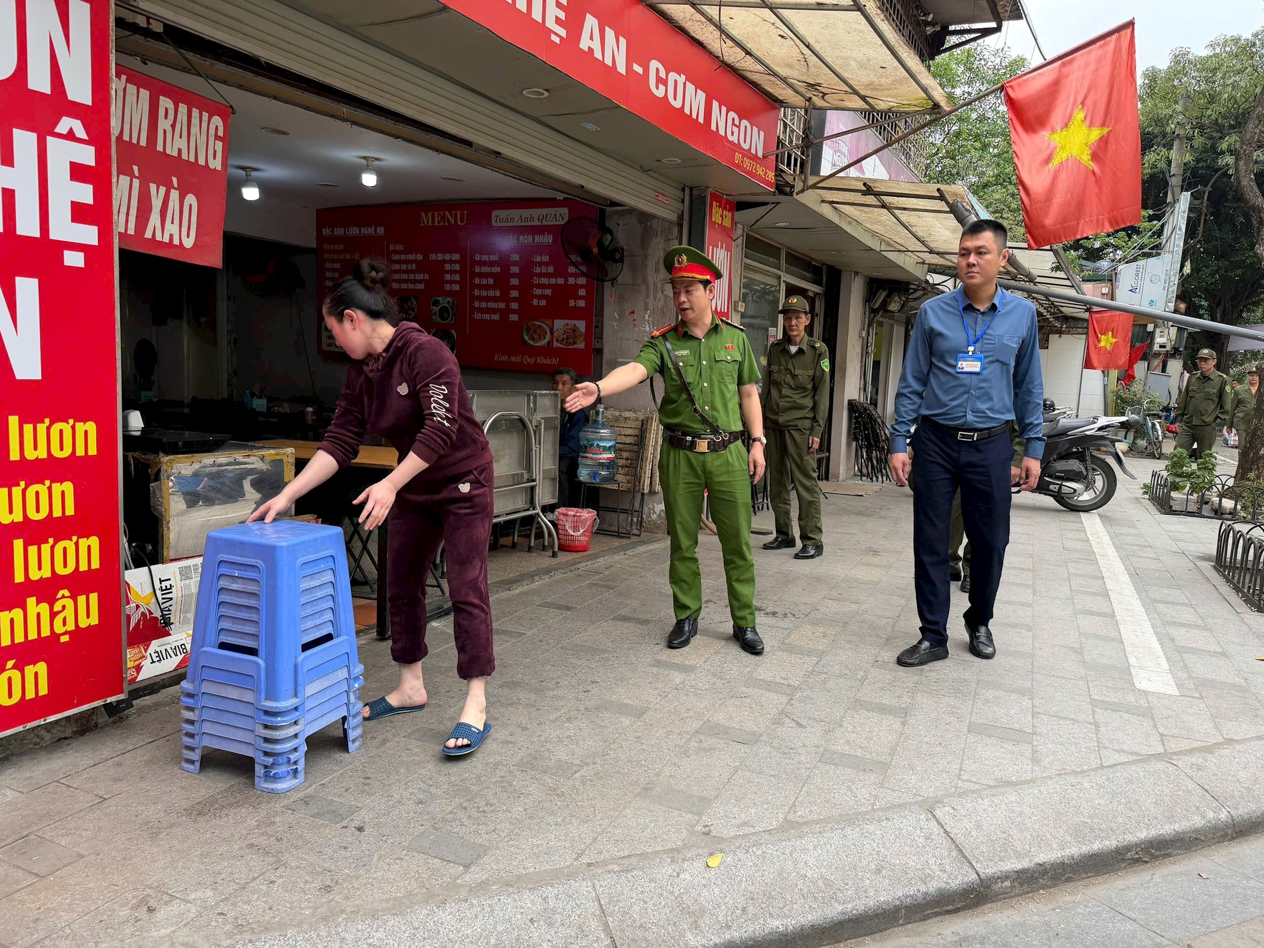 Cán bộ Công an phường Ô Chợ Dừa cùng lực lượng chức năng tuyên truyền, nhắc nhở hộ kinh doanh chấp hành quy định, không lấn chiếm vỉa hè, góp phần xây dựng đô thị văn minh. Ảnh: P.V