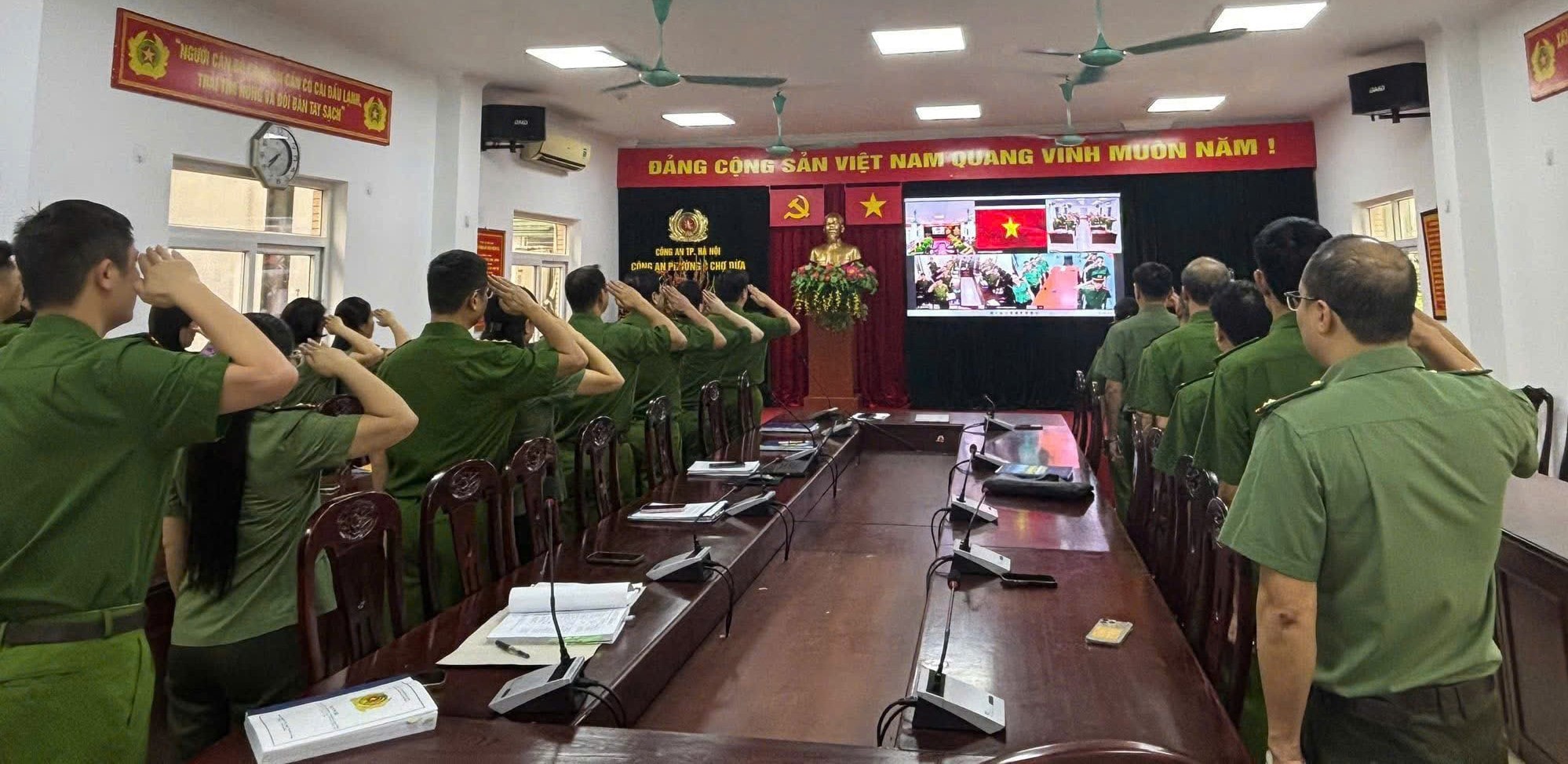 Cán bộ, chiến sĩ Công an phường Ô Chợ Dừa thực hiện nghi lễ chào cờ, quán triệt nhiệm vụ công tác. Ảnh: P.V