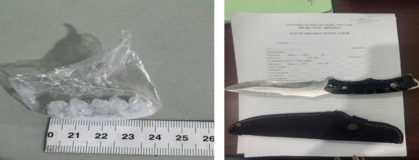 Khi kiểm tra, lực lượng Công an phát hiện trong túi quần đối tượng có 1 gói nylon chứa ma túy đá và 1 con dao dài khoảng 26cm giấu trong người.
