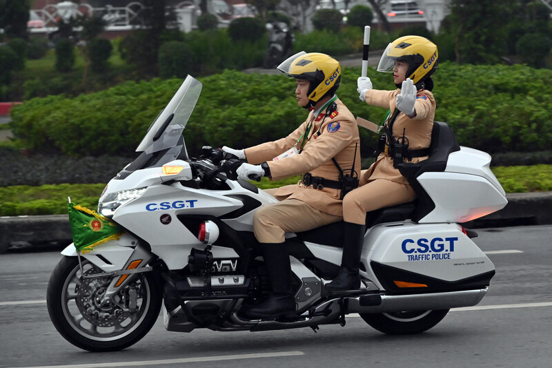 Cảnh sát giao thông Hà Nội trên phương tiện chuyên dụng thực hiện công tác dẫn đoàn. Ảnh: CAHN