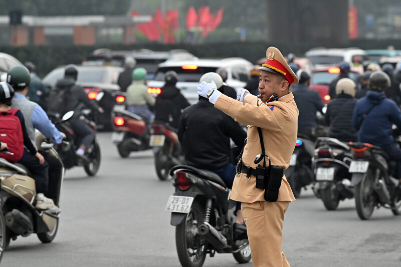 Sau khi đoàn xe đưa các đại biểu vào Trung tâm hội nghị Quốc gia, các lực lượng Công an Thủ đô đã tập trung phân luồng, giảm thiểu ùn tắc giao thông. Ảnh: CAHN