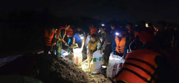CBCS Công an phối hợp lực lượng quân đội và nhân dân gia cố đê Chã trong đêm 8/10.