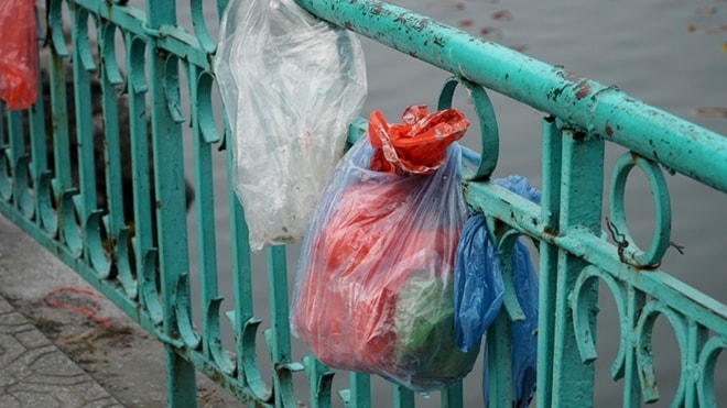 Những túi ni lông buộc lại trên hàng rào chắn trên bờ hồ Tây gần đường Thanh Niên. Một người dân địa phương ở đây cho biết những túi ni lông này xuất hiện nhan nhản trong và sau ngày 23 tháng Chạp âm lịch hàng năm.