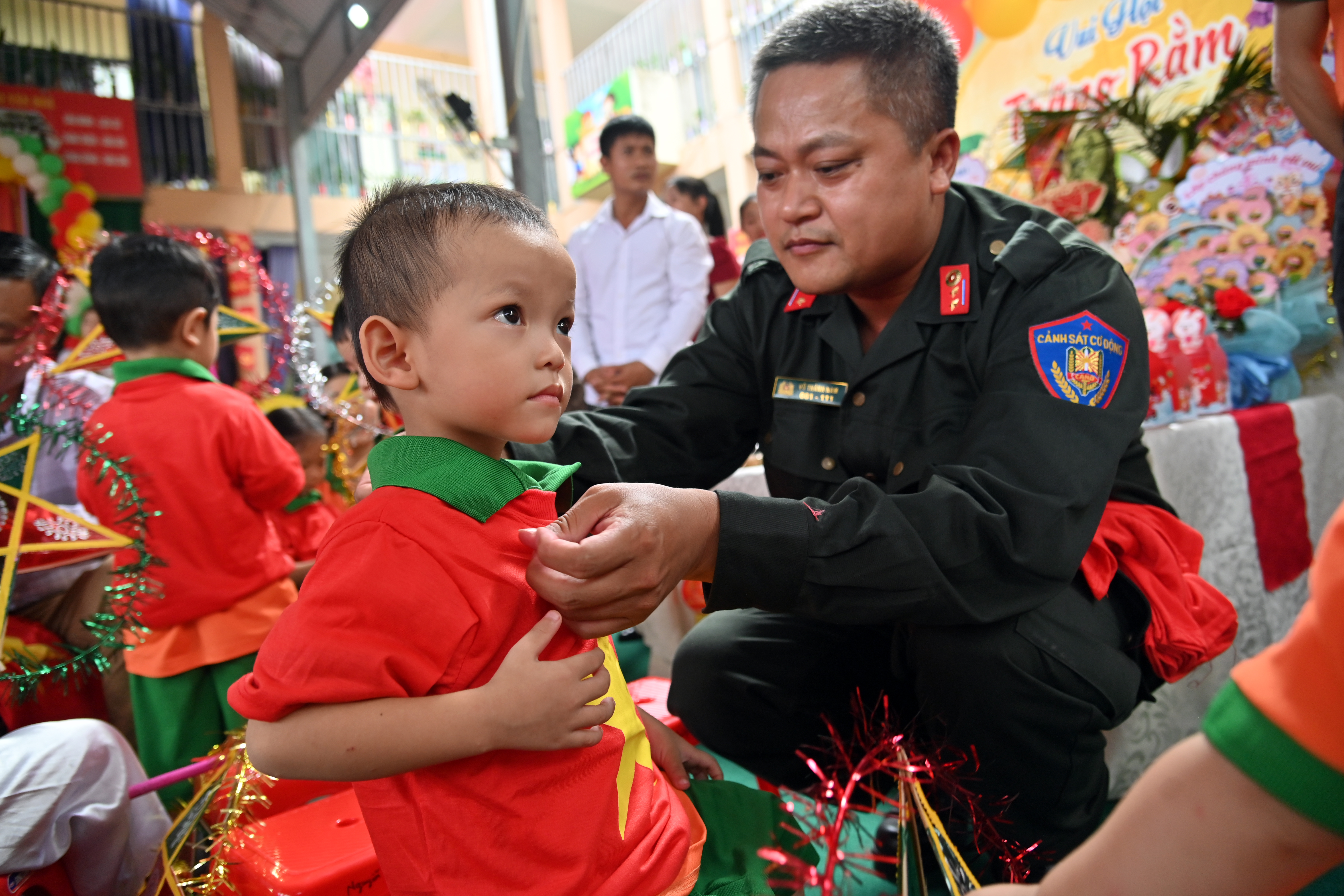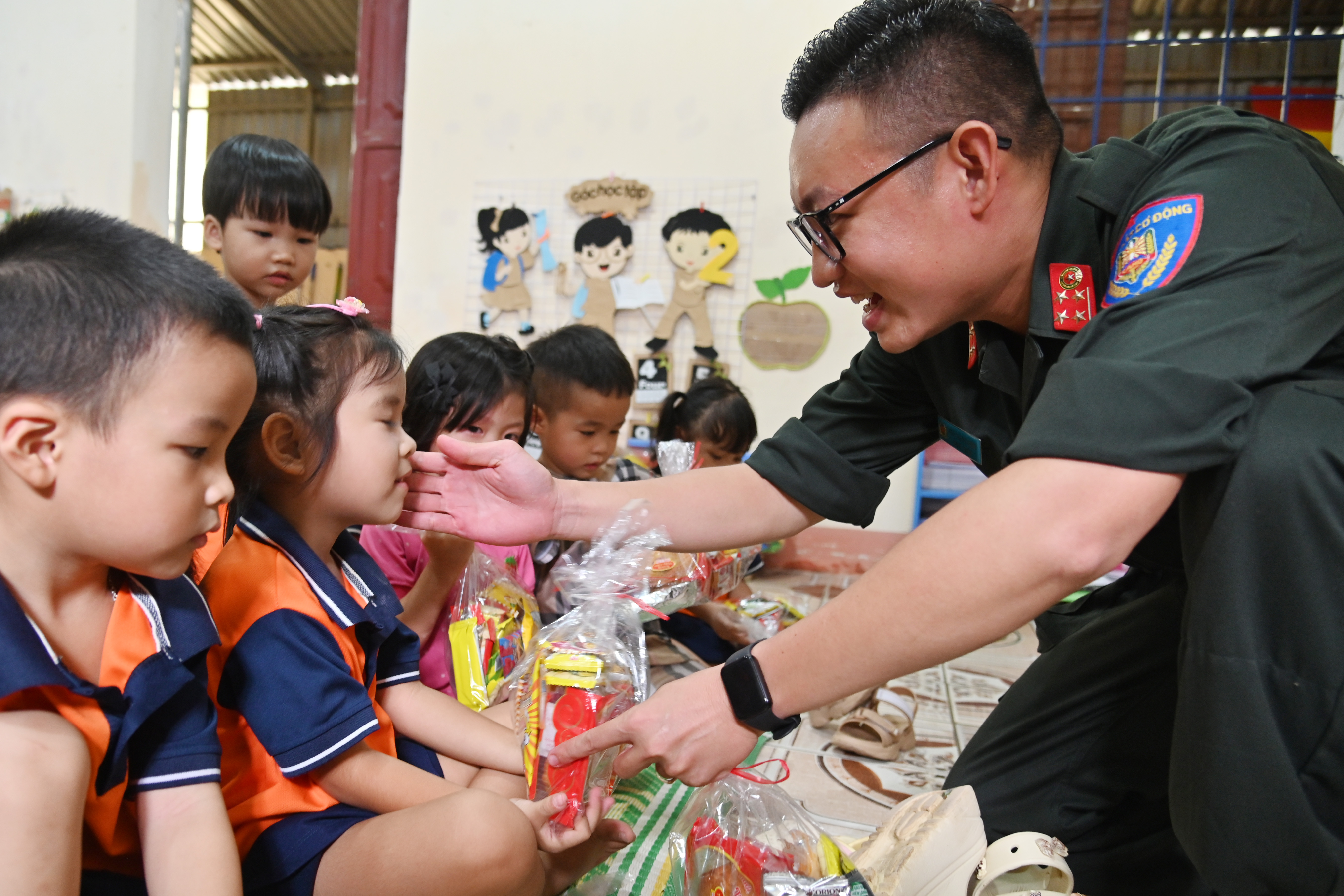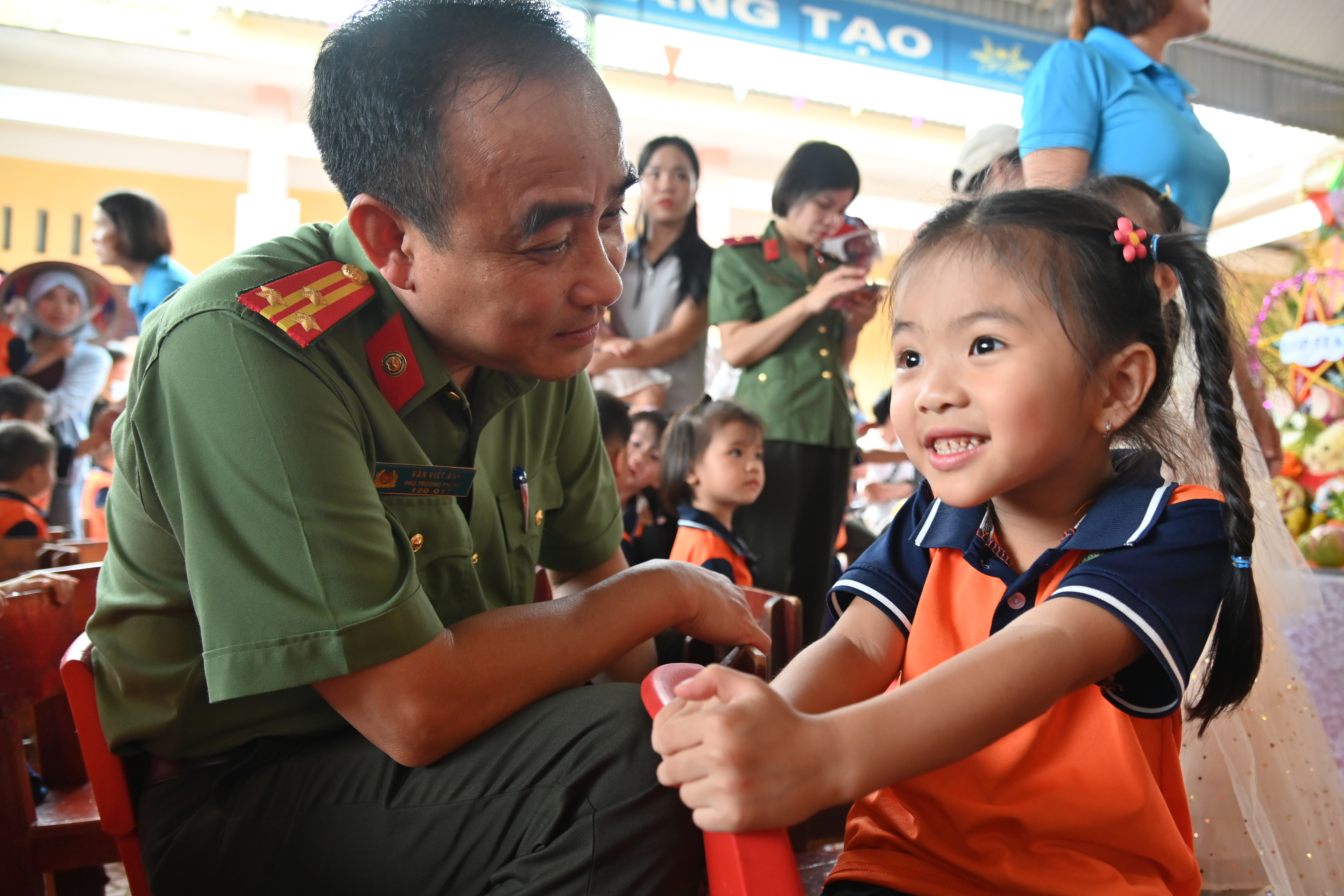 Thượng tá Văn Việt Anh - Phó Trưởng Phòng Hậu cần, Công an thành phố Hà Nội thăm hỏi các em nhỏ trường mầm non Phượng Vĩ