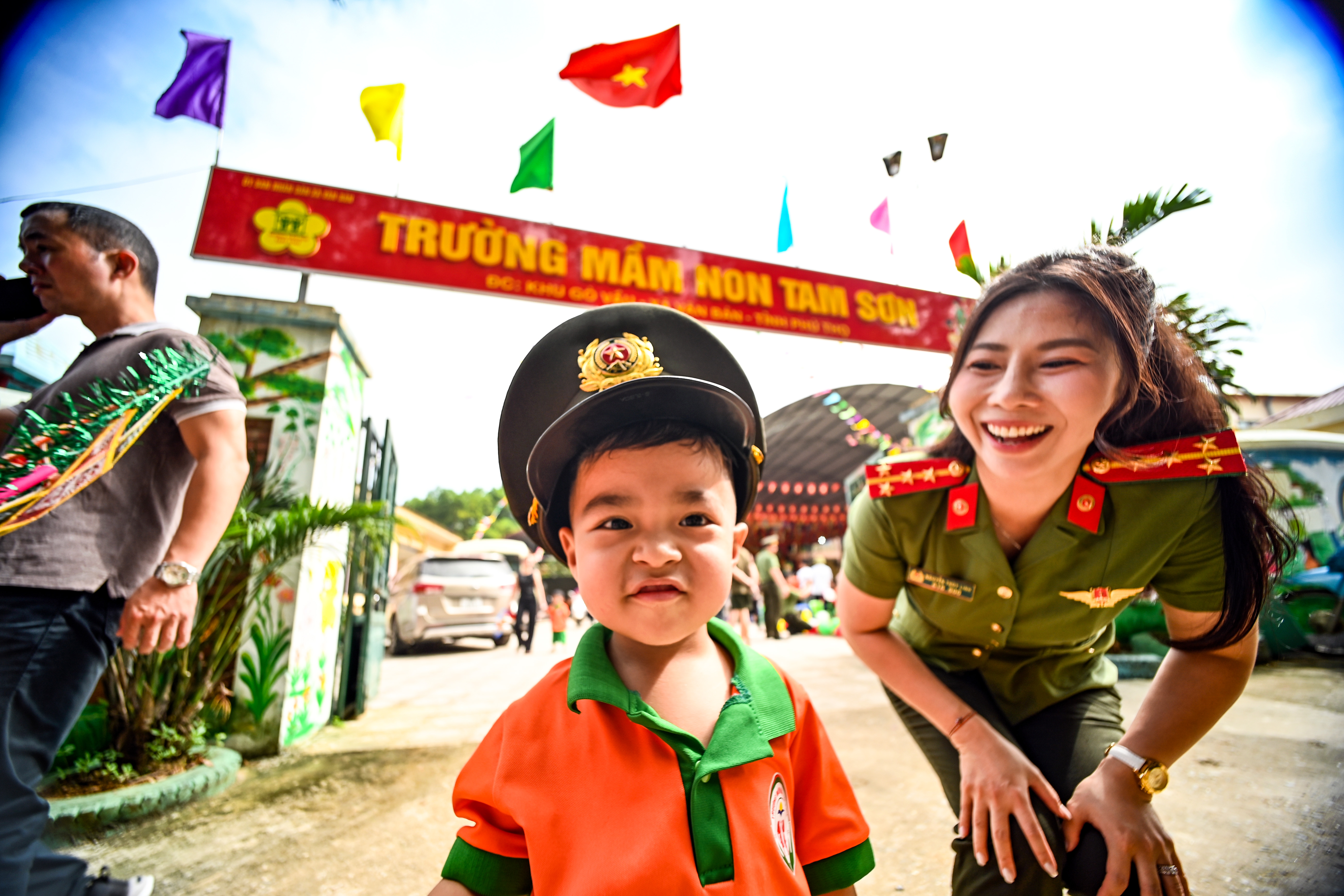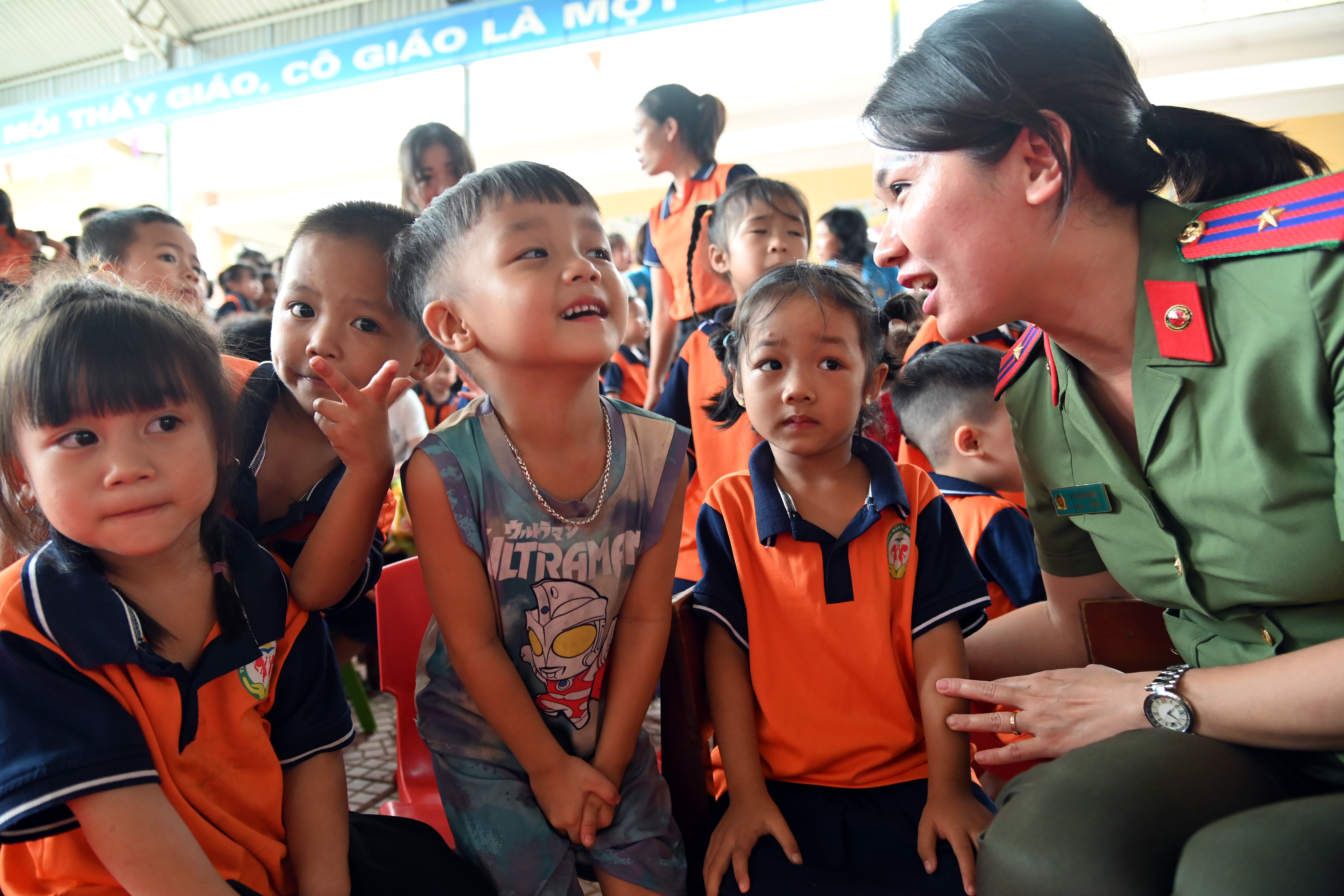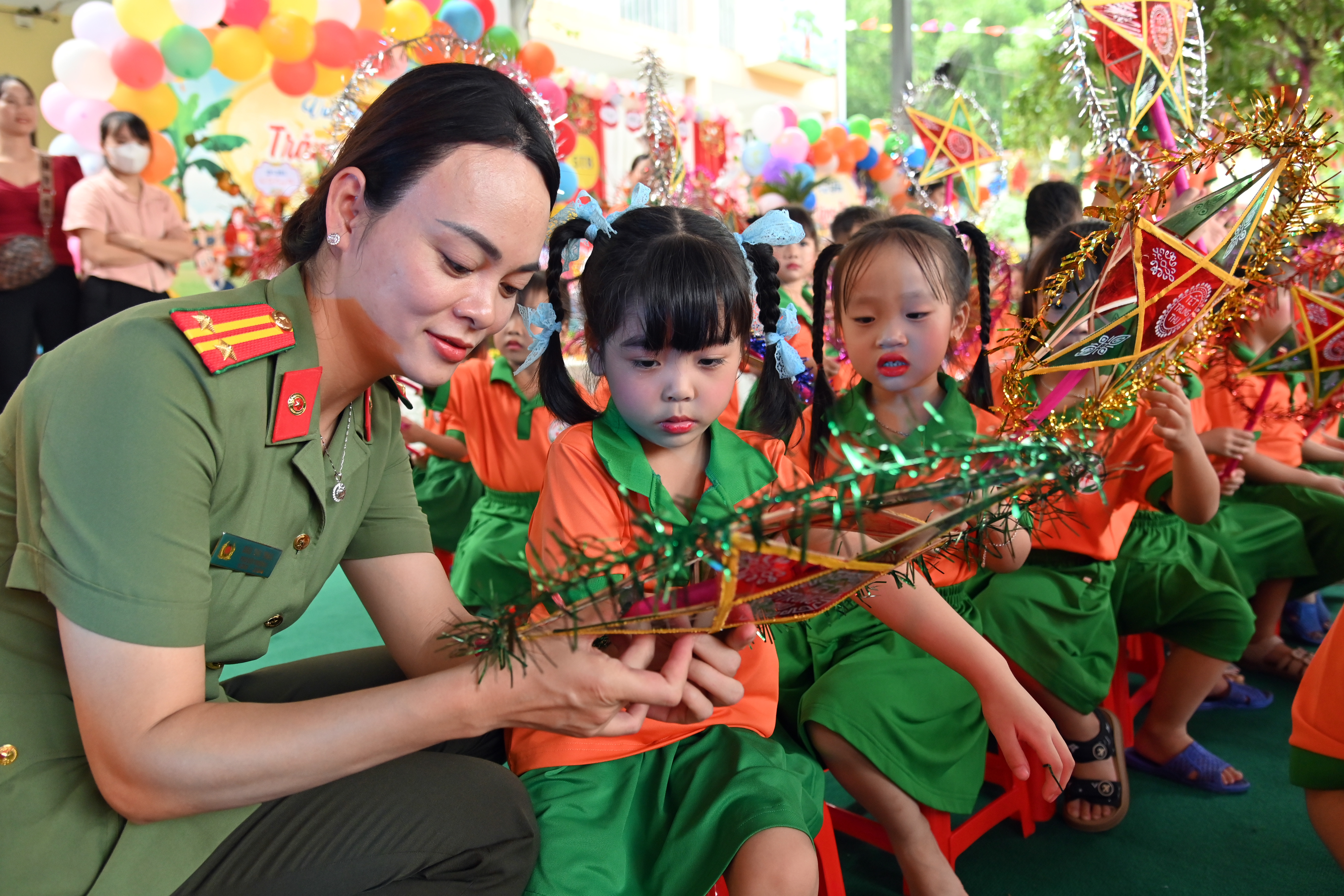 Thượng tá Văn Việt Anh - Phó Trưởng Phòng Hậu cần, Công an thành phố Hà Nội thăm hỏi các em nhỏ trường mầm non Phượng Vĩ