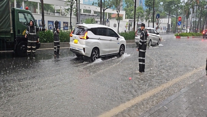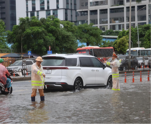 Tại tuyến đường Phạm Hùng, mưa lớn khiến nhiều đoạn ngập sâu, có nơi nước dâng hơn 40cm. Đội CSGT đường bộ số 6 đã chủ động phân luồng từ xa, hướng dẫn các phương tiện di chuyển an toàn qua khu vực.