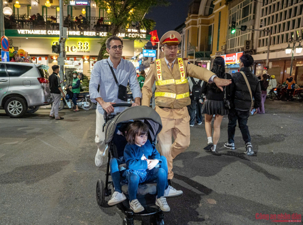 Cán bộ CSGT Hà Nội hỗ trợ du khách di chuyển tại khu vực trung tâm để đến điểm chờ đón xem bắn pháo hoa chào mừng năm mới 2026.
