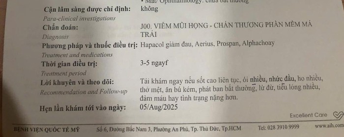 Ngay tối hôm đó, gia đình đã đưa cháu tới bệnh viện thăm khám. Giấy chứng nhận điều trị cho bé H.N.L của Bệnh viện Quốc tế Mỹ cho thấy, bé bị Viêm mũi họng - Chấn thương phần mềm má trái.