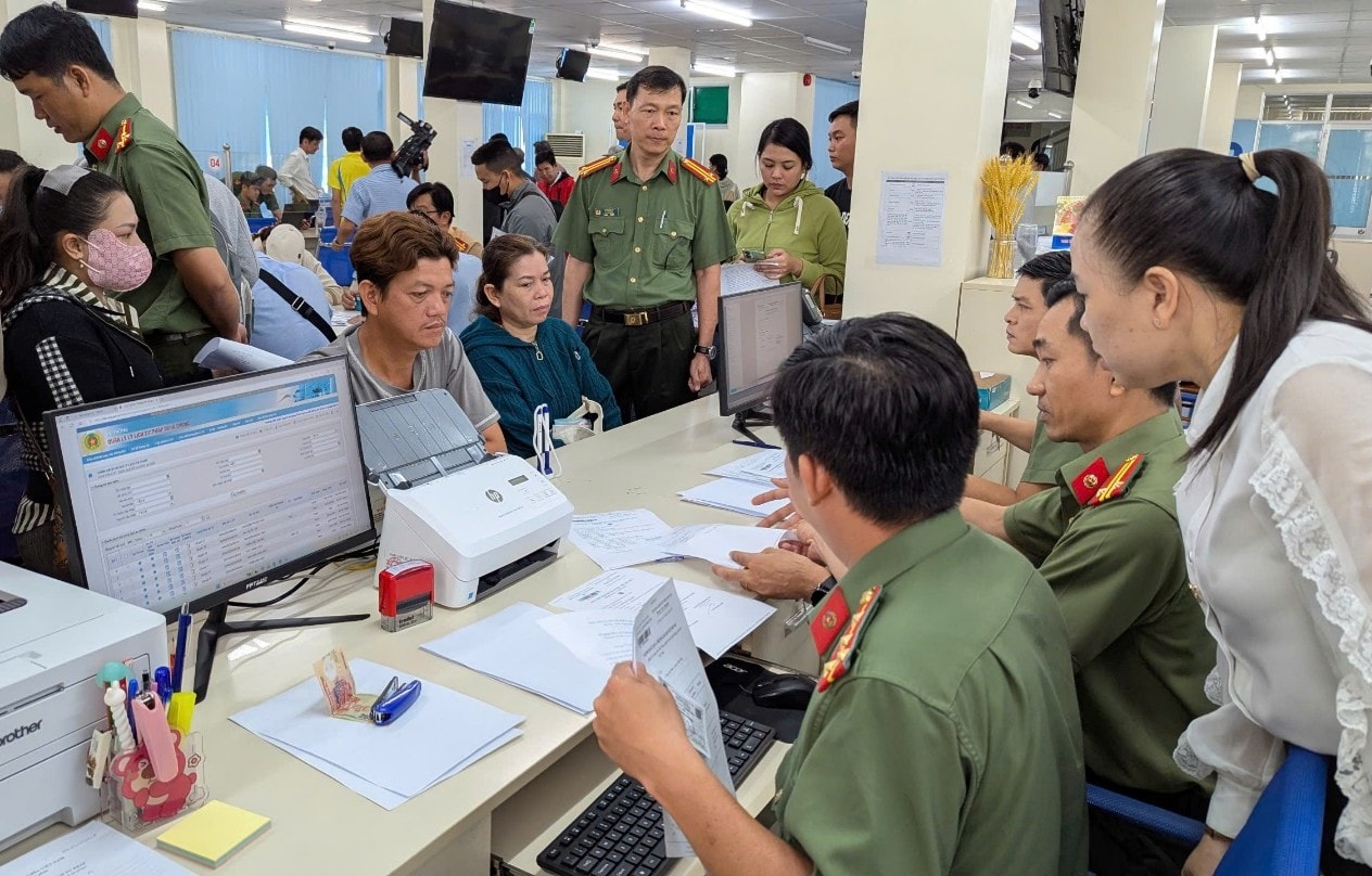 Cán bộ Phòng Hồ sơ nghiệp vụ Công an tỉnh An Giang tiếp nhận hồ sơ công dân.
