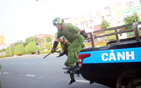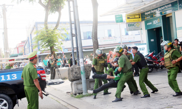 Tình huống giả định, vào lúc 8h sáng, tại Phòng giao dịch ngân hàng BIDV Chi nhánh Kiên Giang (trên đường Phan Thị Ràng, phường Rạch Giá, tỉnh An Giang), có 2 đối tượng mặc áo khoác, đeo khẩu trang, mang theo ba lô, có đem theo hung khí đi xe máy hai bánh đến ngân hàng. Hai đối tượng giả danh khách hàng vào ngân hàng giao dịch và ngồi quan sát. Sau đó, các đối tượng xông vào khu vực làm việc, uy hiếp nhân viên ngân hàng để cướp tài sản. Hai đối tượng đã lấy một số tiền lớn bỏ vào ba lô và nhanh chóng tẩu thoát. Khi hai đối tượng ra bên ngoài ngân hàng thì bị các lực lượng bao vây, khống chế, bắt giữ.