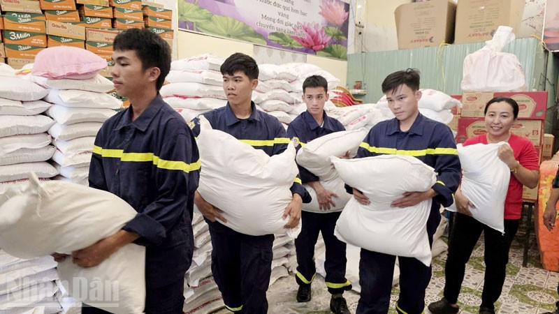 Đoàn viên thanh niên Công an tỉnh An Giang tập kết hàng hóa cứu trợ đồng bào miền trung.