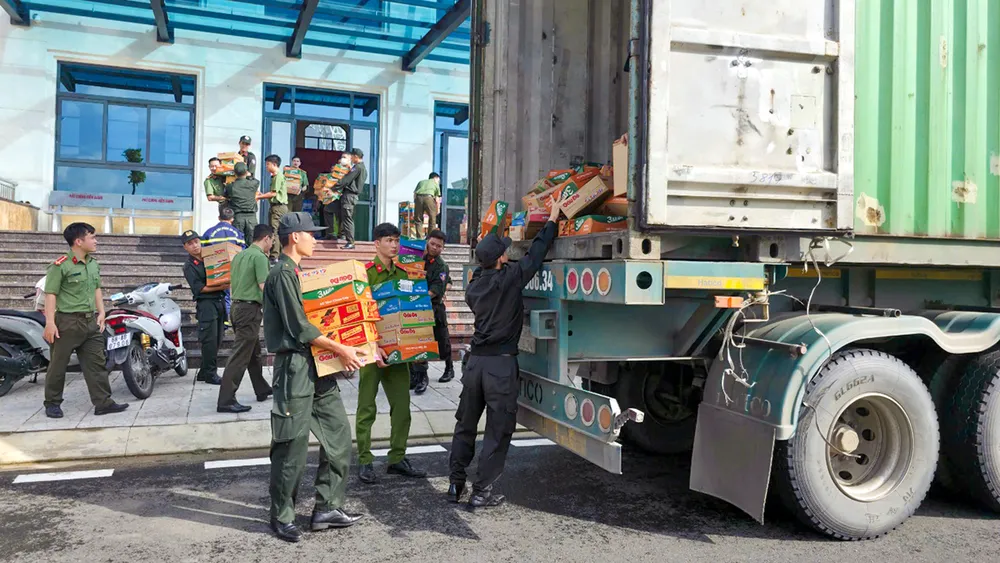 Đoàn viên thanh niên Công an tỉnh An Giang tập kết hàng hóa vận chuyển lên xe tải để cứu trợ đồng bào miền Trung. Ảnh: VĂN VŨ
