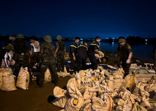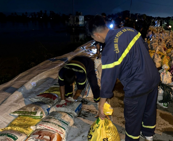 Phòng Cảnh sát PCCC và CNCH Công an tỉnh Bắc Ninh phối hợp cùng Công an phường Kinh Bắc, Lữ đoàn pháo binh 675 và người dân Thôn Đẩu Hàn, tham gia hộ đê Đẩu Hàn, phường Kinh Bắc.