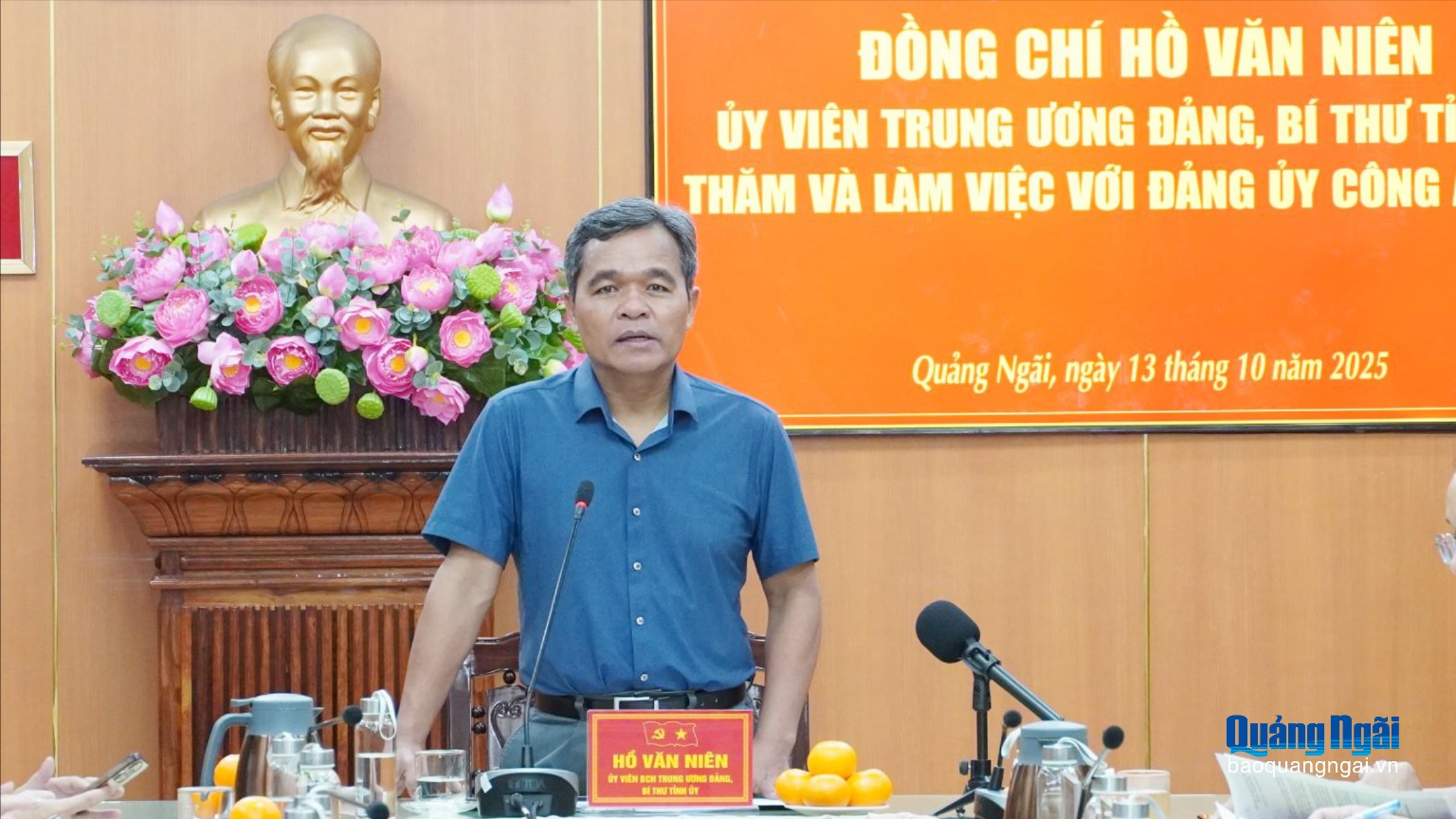 Sáng 13/10, Ủy viên Trung ương Đảng, Bí thư Tỉnh ủy Hồ Văn Niên có buổi làm việc với Đảng ủy Công an tỉnh về tình hình, kết quả thực hiện nhiệm vụ 9 tháng năm 2025 và phương hướng, nhiệm vụ trọng tâm 3 tháng cuối năm.