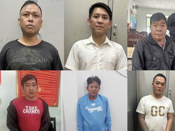 Các đối tượng Hoàng Thái Thuận, Trần Quang Thuận, Lê Văn Tài, Nguyễn Hoàng Bảo, Nguyễn Tuyền Tuyến và Đinh Chí Công tại cơ quan Công an.