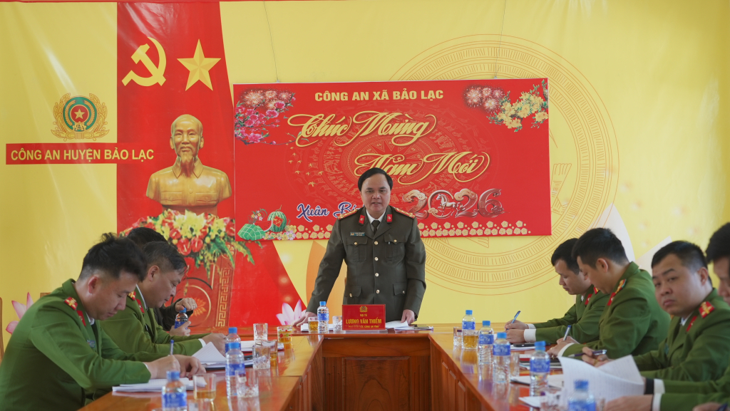 Phó Giám đốc Công an tỉnh Lương Văn Thiểm phát biểu tại buổi làm việc với Công an xã Bảo Lạc.