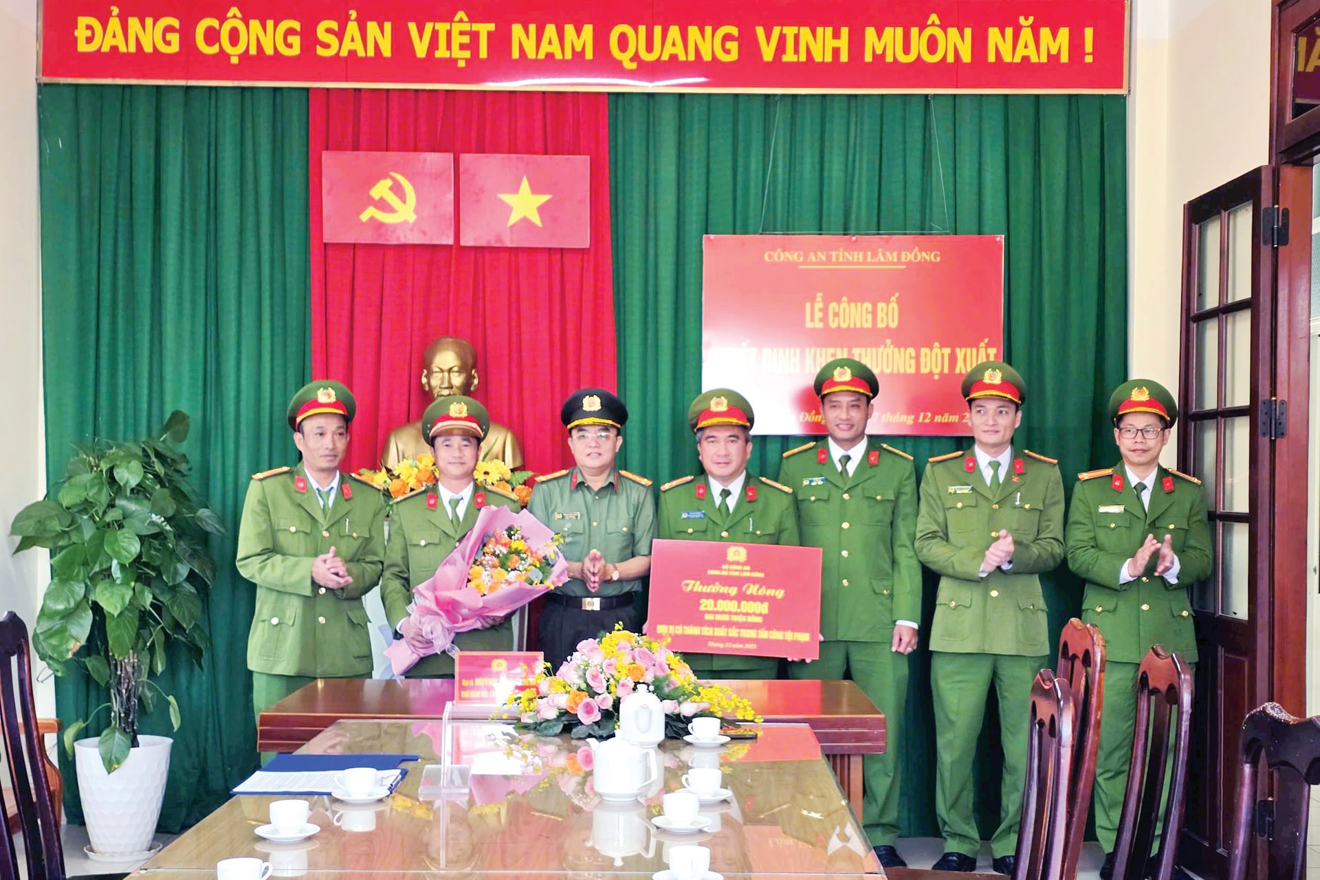 Đại tá Huỳnh Ngọc Liêm, Phó Giám đốc Công an tỉnh được ủy quyền trực tiếp trao thưởng và biểu dương Công an phường Xuân Hương - Đà Lạt lập thành tích xuất sắc trong vụ truy tìm tài sản bị mất cắp của hoa hậu Mexico tại Đà Lạt. Ảnh: Võ Trang