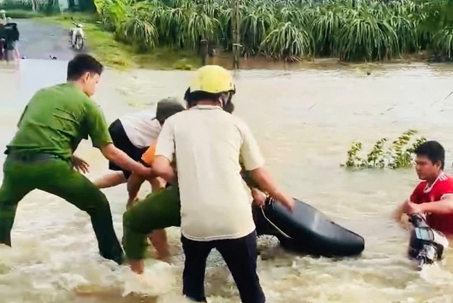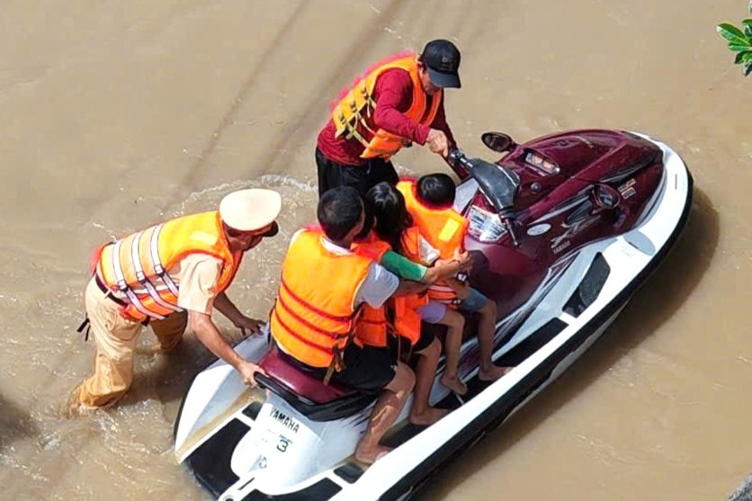 Lực lượng Cảnh sát PCCC và CNCH chủ động sử dụng ca nô di dời người dân ở vùng bị ngập sâu do ảnh hưởng của bão.