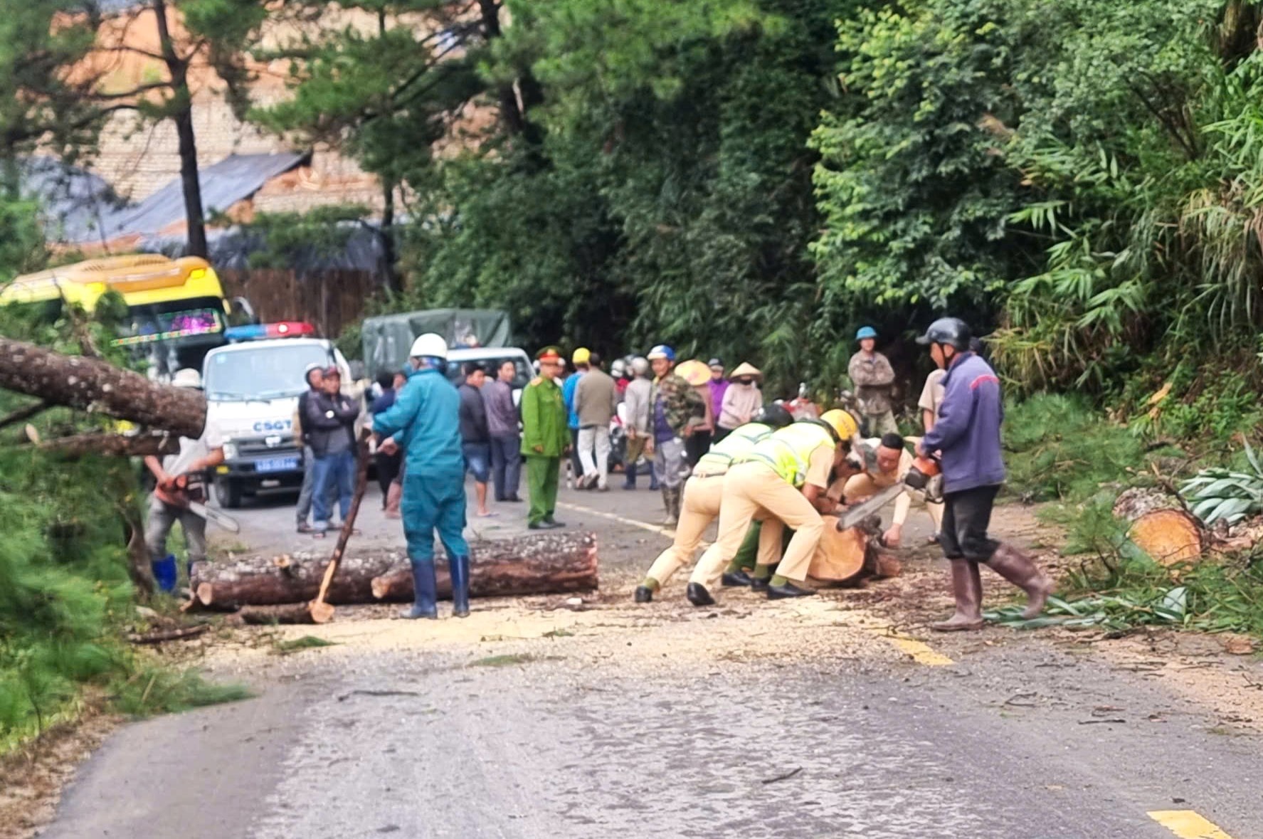 Huy động các lực lượng giải tỏa cây gỗ gãy đổ do ảnh hưởng của bão, đảm bảo giao thông thông suốt.