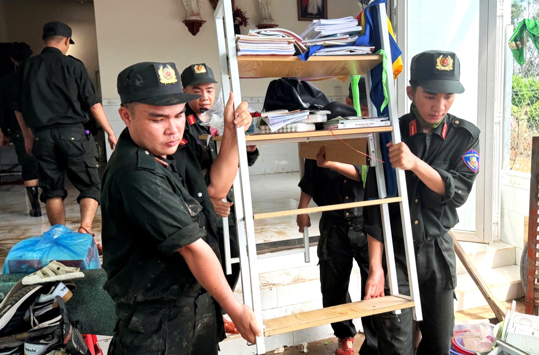 Lực lượng Cảnh sát cơ động giúp người dân di dời các vật dụng, chủ động phòng chống bão số 13.