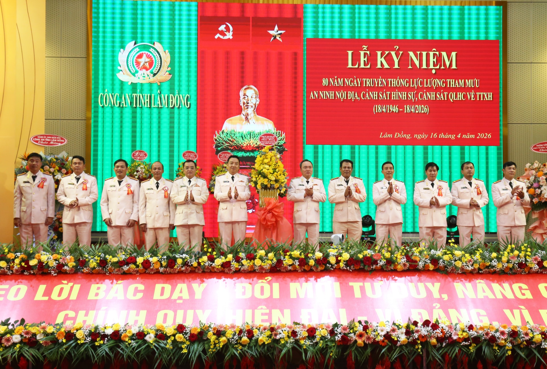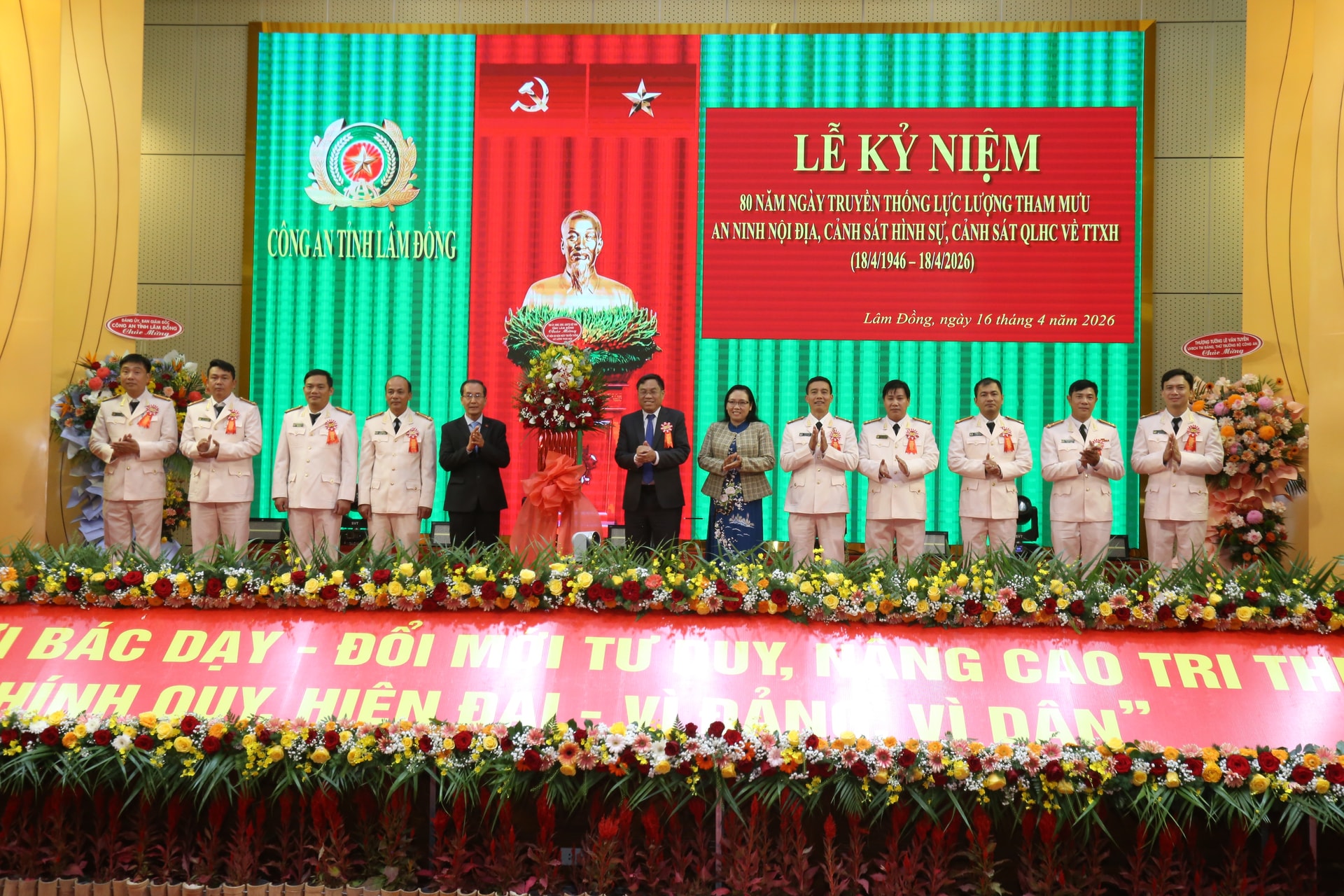 Ban Giám đốc Công an tỉnh Lâm Đồng tặng hoa chúc mừng các lực lượng