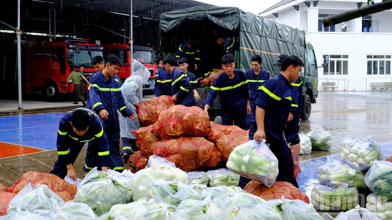 Tại các điểm tiếp nhận, Công an tỉnh Khánh Hòa phối hợp chính quyền địa phương tổ chức tiếp nhận và phân bổ về các khu vực bị ảnh hưởng nặng, nhất là các điểm còn khó khăn trong tiếp cận nguồn thực phẩm sau mưa bão.
