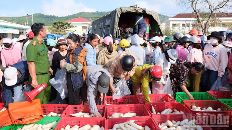 Cấp phát rau, củ, quả cho người dân vùng bị ảnh hưởng nặng do mưa lũ vừa qua tại Khánh Hòa.