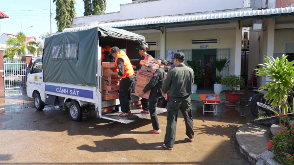 Công an Lâm Đồng chuẩn bị lương thực, thục phẩm và tiếp tế cho bà con vùng bị ngập.