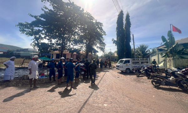 Công an xã Hàm Thuận Bắc triển khai lực lượng tại thôn Lâm Giang.