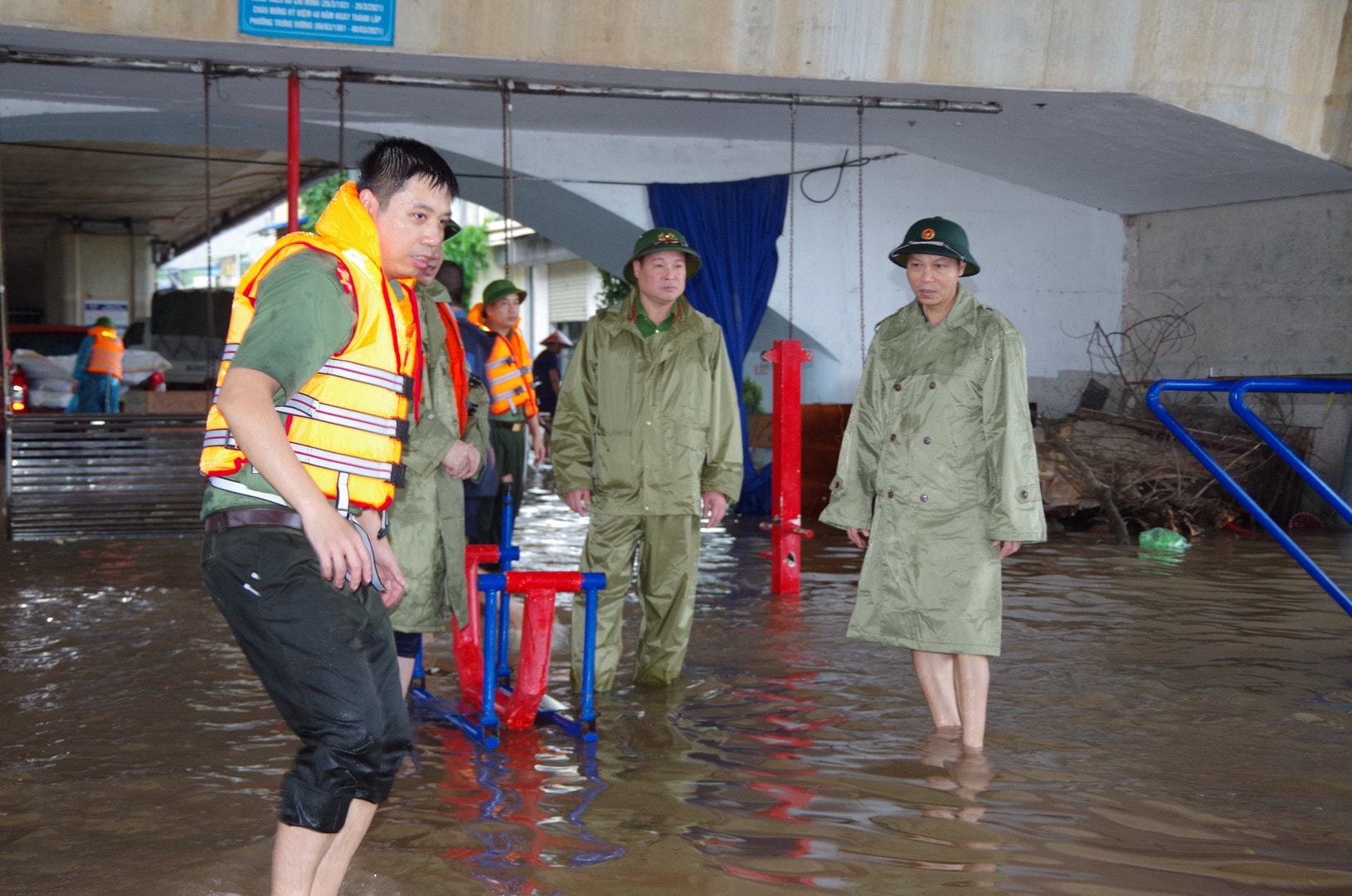 Phó Bí thư Tỉnh ủy, Chủ tịch Ủy ban nhân dân tỉnh Thái Nguyên Phạm Hoàng Sơn cùng Giám đốc Công an tỉnh Thái Nguyên Thiếu tướng Bùi Đức Hải trực tiếp chỉ đạo các lực lượng gia cố đê sông Cầu.
