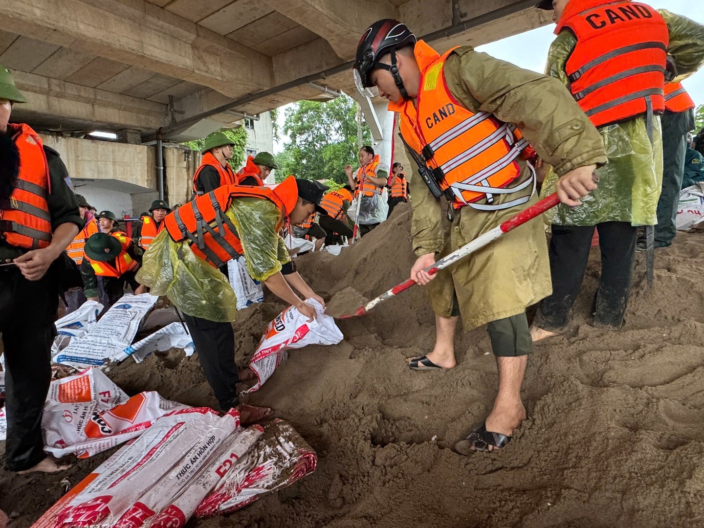 Đặc biệt, mưa lớn khiến mực nước sông Cầu dâng lên nhanh, nhiều vị trí vượt mức báo động, Giám đốc Công an tỉnh đã huy động hàng trăm cán bộ, chiến sĩ phối hợp với lực lượng Quân đội và các đơn vị chức năng vận chuyển các nguyên vật liệu gia cố đê sông Cầu.