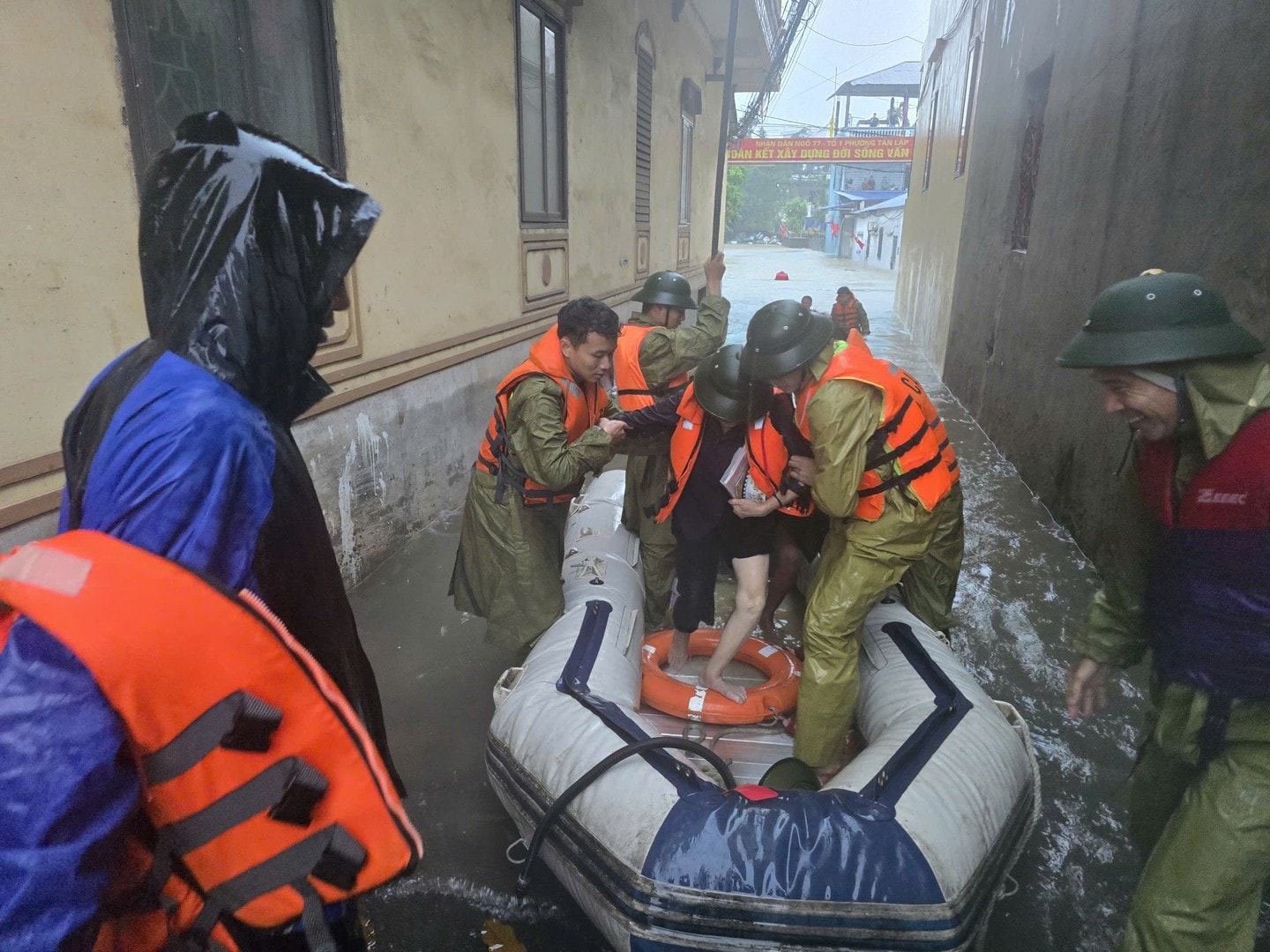 Lực lượng Công an, quân đội phối hợp giúp đỡ đưa người dân ra khỏi khu vực ngập lụt.