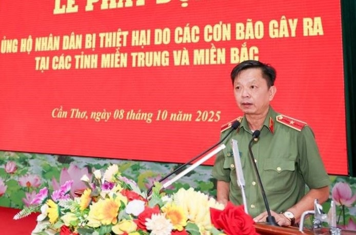 Thiếu tướng Huỳnh Việt Hòa - Giám đốc Công an TP. Cần Thơ phát biểu tại lễ phát động ủng hộ đồng bào bị ảnh hưởng bởi bão số 10
