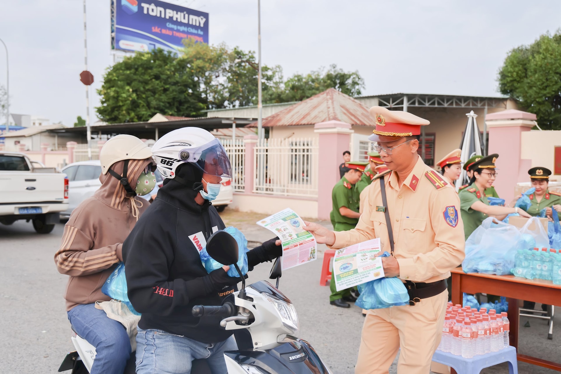 Cán bộ, chiến sĩ Công an thành phố Cần Thơ trao các phần nước uống và đồ ăn nhanh miễn phí cho người dân.
