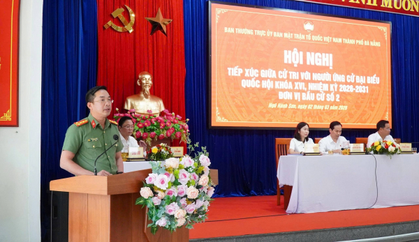 Còn tại tiếp xúc cử tri tại các phường Ngũ Hành Sơn, An Hải, Sơn Trà, Hòa Xuân, Cẩm Lệ (Đà Nẵng), Đại tá Nguyễn Đại Đồng, Phó Giám đốc Công an TP Đà Nẵng, ứng cử viên ĐBQH khóa XVI, nhiệm kỳ 2026 02031 đã nhấn mạnh quan điểm xuyên suốt: Lấy sự bình yên, an toàn và chất lượng cuộc sống của nhân dân làm mục tiêu cao nhất, xác định bảo đảm an ninh, trật tự là điều kiện tiên quyết để thành phố phát triển nhanh, bền vững và hội nhập quốc tế sâu rộng.