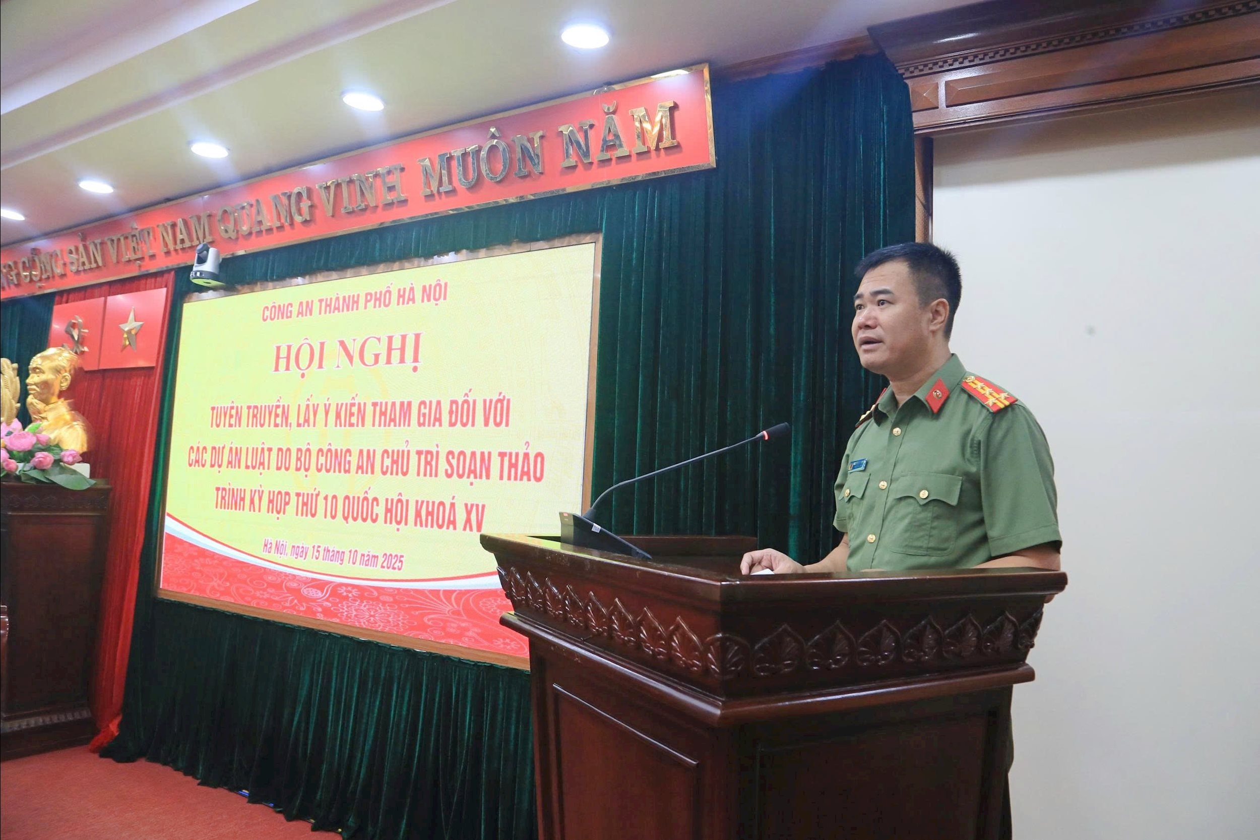 Phát biểu tại Hội nghị, Phó Giám đốc Công an TP. Hà Nội, Đại tá Nguyễn Ngọc Quyền cho biết, theo chương trình Kỳ họp thứ 10 Quốc hội Khóa XV, Bộ Công an sẽ trình 11 dự án luật có ý nghĩa chính trị, pháp lý rất quan trọng, bao gồm:
