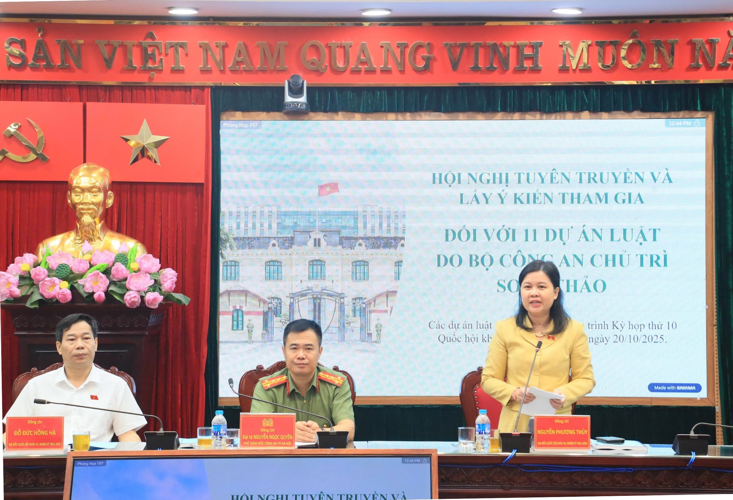 Phó Chủ nhiệm Ủy ban Pháp luật và Tư pháp Nguyễn Phương Thủy đánh giá cao Công an TP. Hà Nội đã chủ động tổ chức hội nghị nhằm thông tin, truyền tải kịp thời các ý kiến từ cơ sở, coi đây là nguồn dữ liệu thực tiễn quý báu cho tổ soạn thảo Bộ Công an nghiên cứu, tiếp thu.