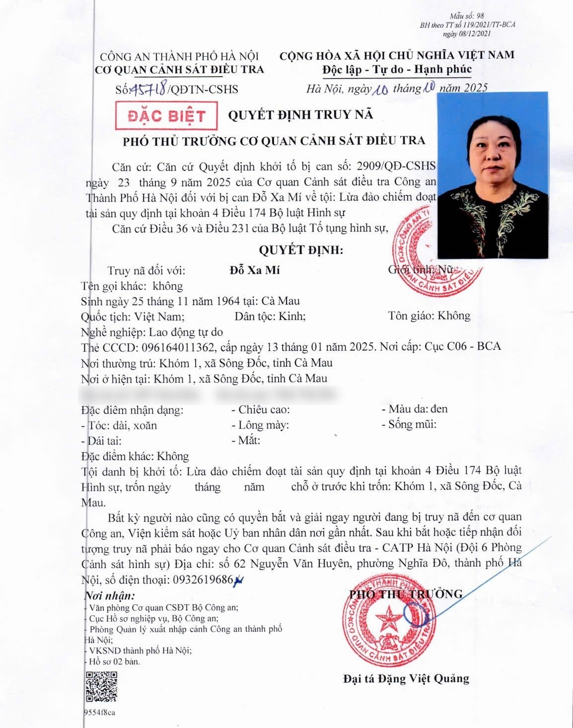 Theo Lao động, ngày 10/11, Công an TP Hà Nội cho biết, Cơ quan CSĐT Công an TP Hà Nội đã ra quyết định truy nã Đỗ Xa Mí (SN 1964; thường trú tại xã Sông Đốc, tỉnh Cà Mau) về tội Lừa đảo chiếm đoạt tài sản.