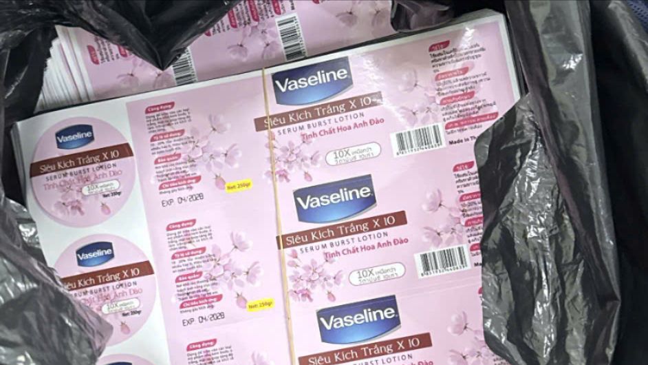 Các sản phẩm đều được in nhãn “sản xuất tại Mỹ”, “made in Thailand”, nhưng không có giấy tờ chứng minh nguồn gốc. Phía sau lớp bao bì bắt mắt là hàng trăm kilôgam hóa chất, kem nền không rõ thành phần cùng hàng nghìn tem nhãn, bao bì in sẵn.