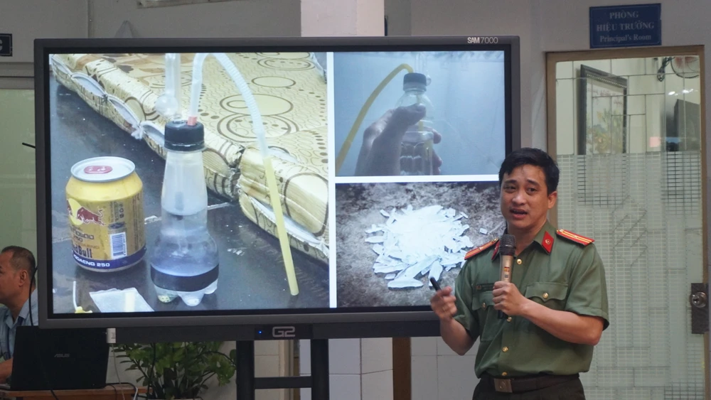 Thiếu tá Nguyễn Thiện Tâm chia sẻ với học sinh về các loại ma túy ngụy trang. Ảnh: NGUYỄN QUYÊN