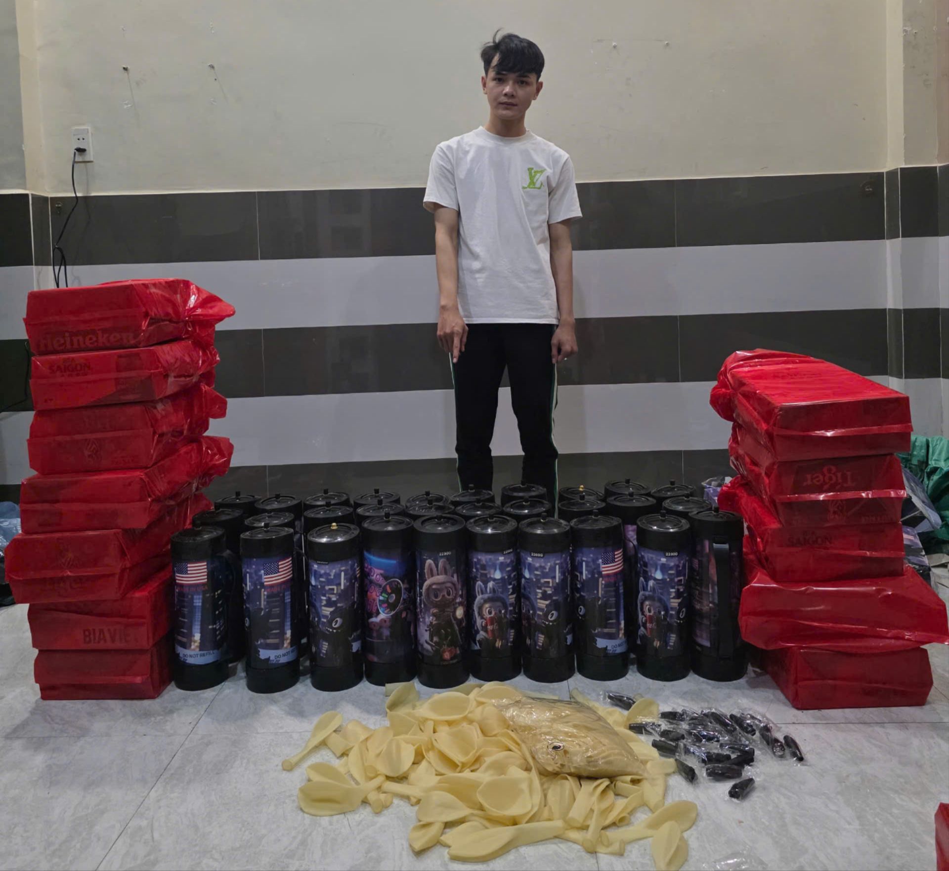 Trước đó, qua các biện pháp nghiệp vụ nắm tình hình, rạng sáng 21-3, lực lượng Phòng Cảnh sát kinh tế Công an TP.HCM kiểm tra một căn nhà trên đường Lê Văn Khương, phát hiện 30 bình khí N₂O cùng nhiều bóng cao su, van dùng để bơm khí.