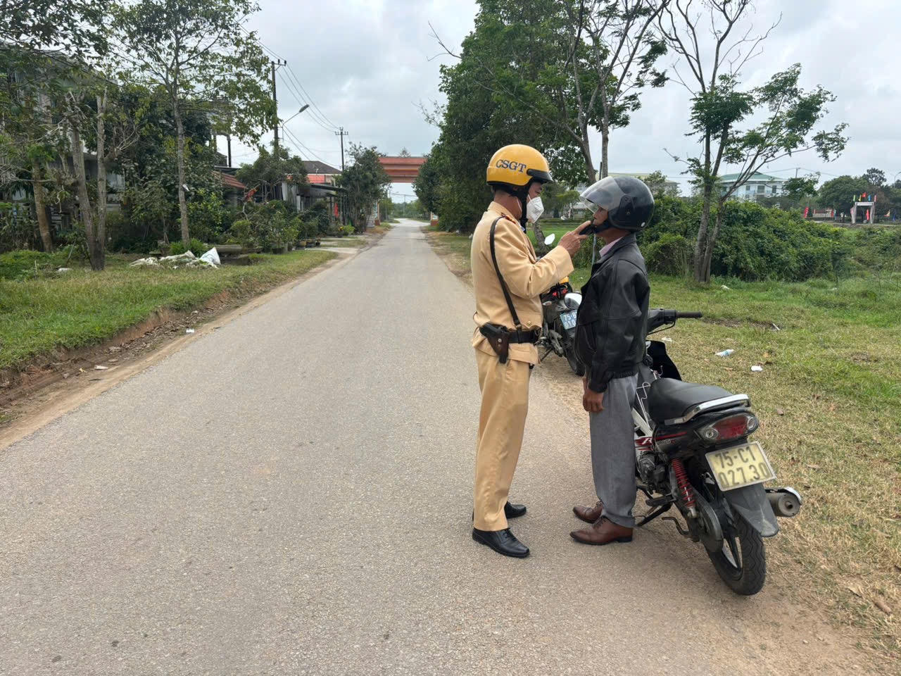 Cán bộ cảnh sát giao thông kiểm tra nồng độ cồn người điều khiển phương tiện trên tuyến đường liên thôn, liên xã.