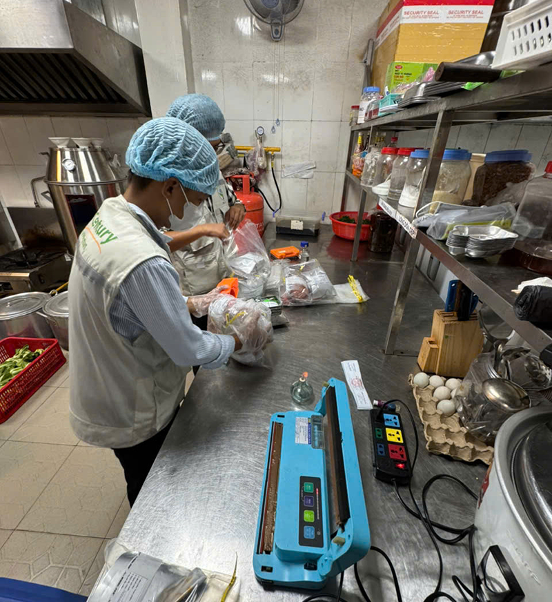 Cơ quan chức năng thu mẫu thực phẩm tại cơ sở chế biến thực phẩm để kiểm nghiệm các chỉ tiêu sinh vật. Ảnh: CA