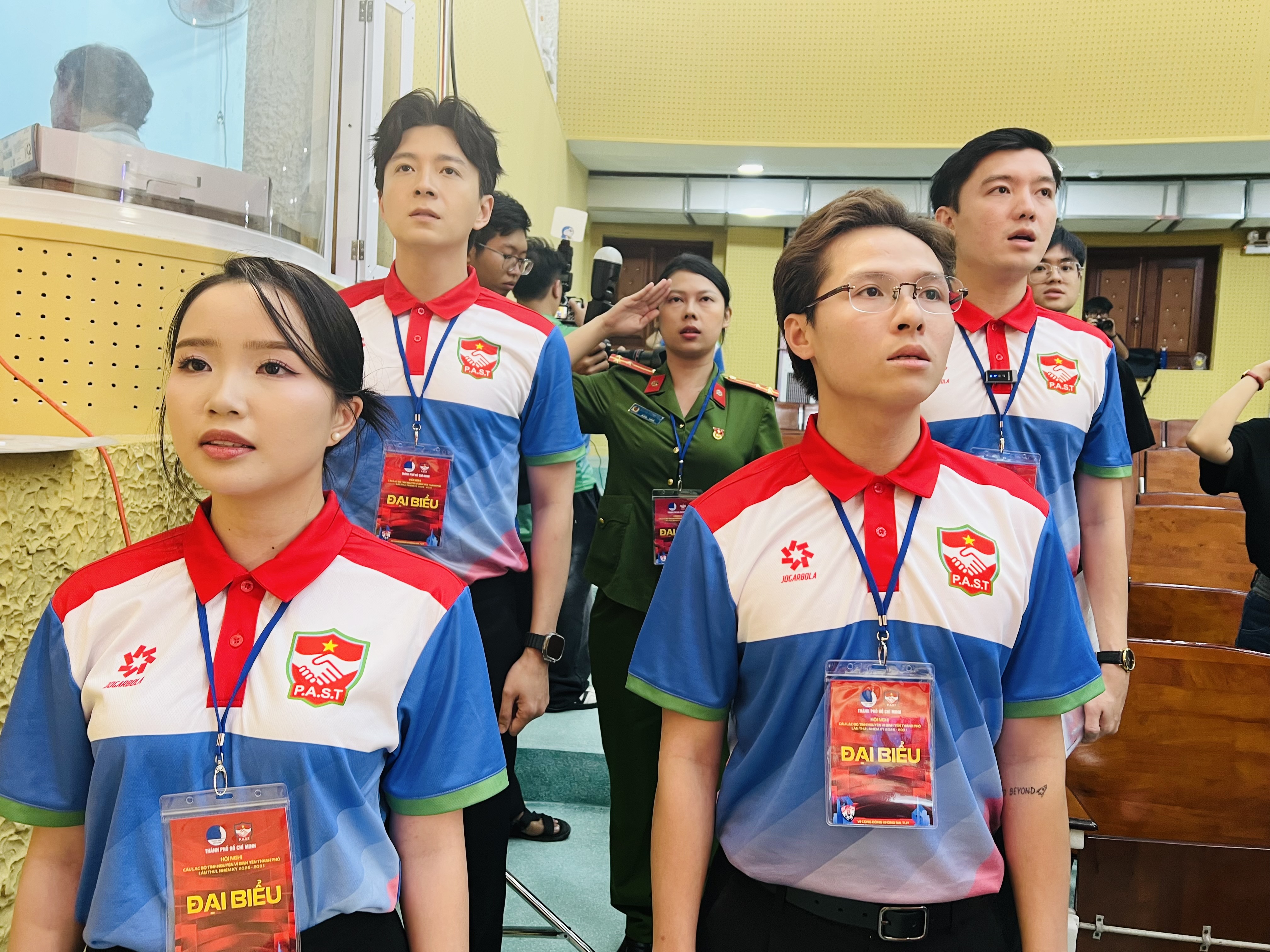 Các đại biểu và Ban chủ nhiệm CLB Tình nguyện Vì bình yên Thành phố thực hiện nghi thức chào cờ