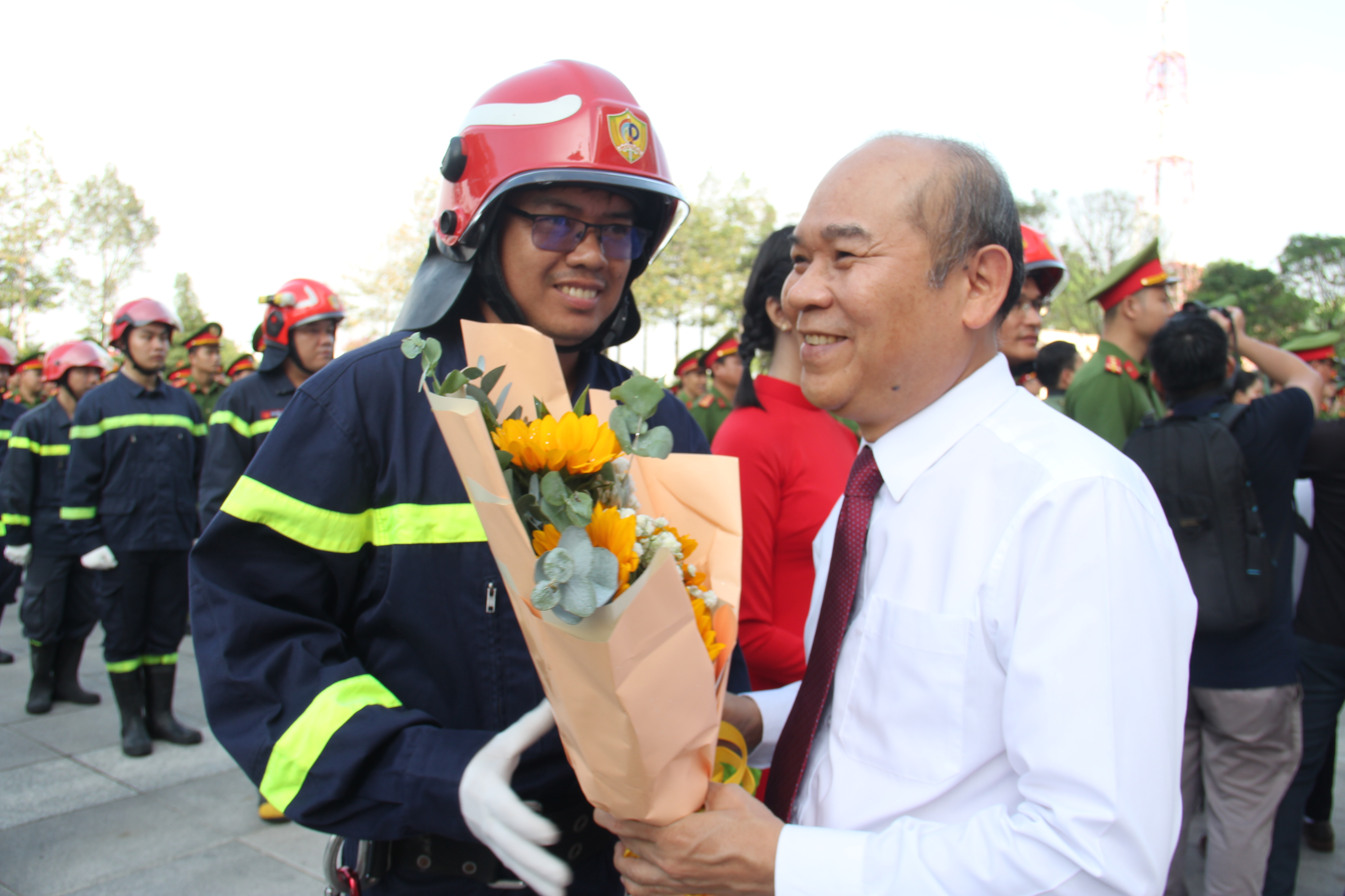 Phó Chủ tịch UBND Thành phố Trần Văn Bảy tặng hoa cho các lực lượng tại lễ ra quân