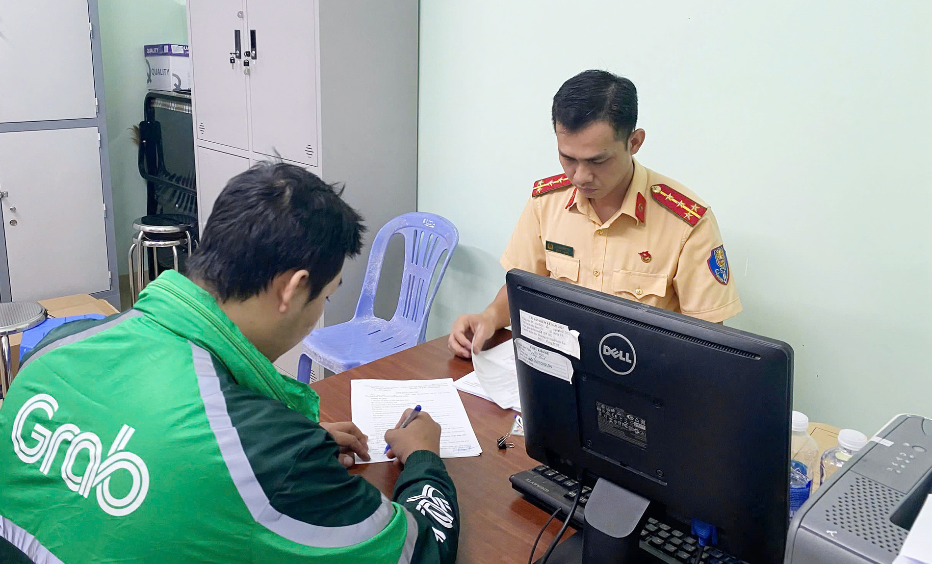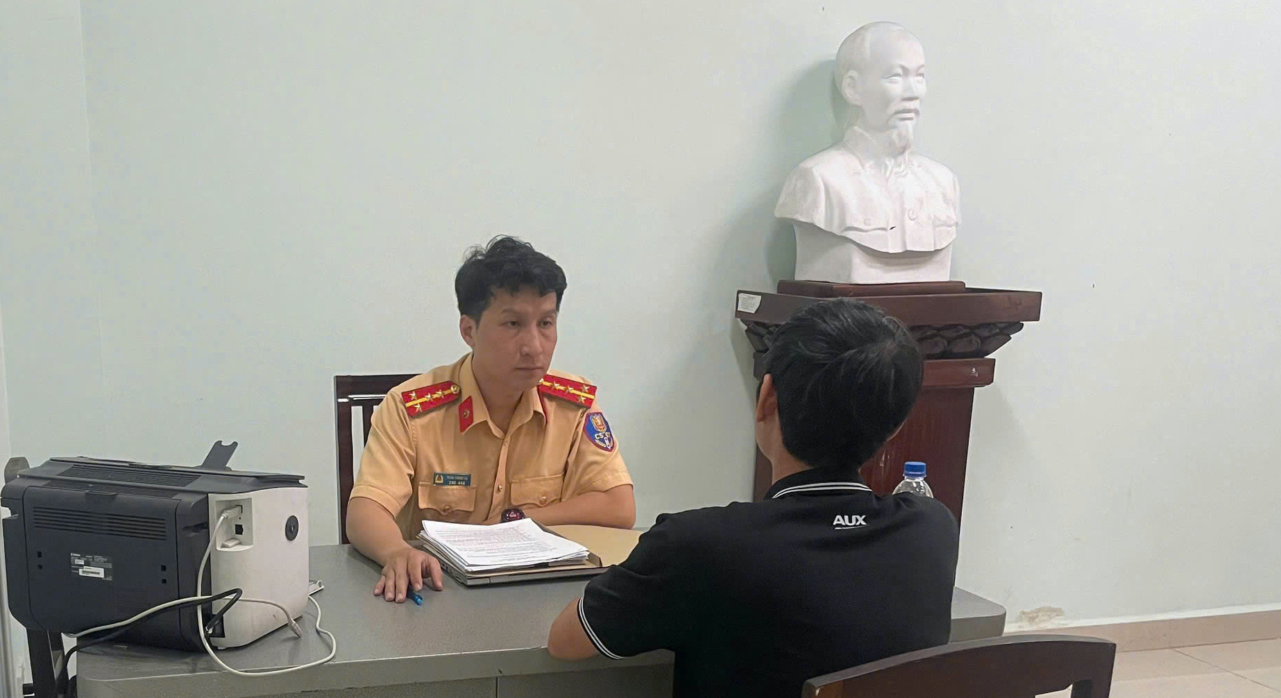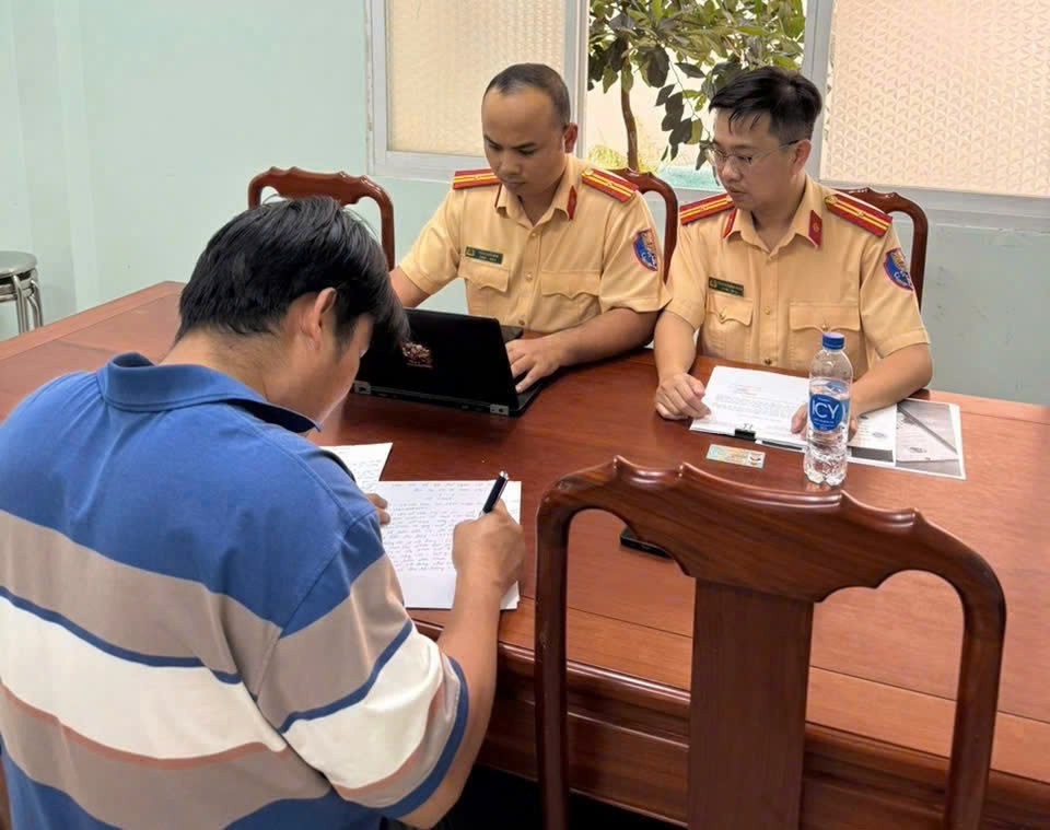 Cán bộ Phòng CSGT làm việc với anh D.T.Q. Ảnh: CSGT