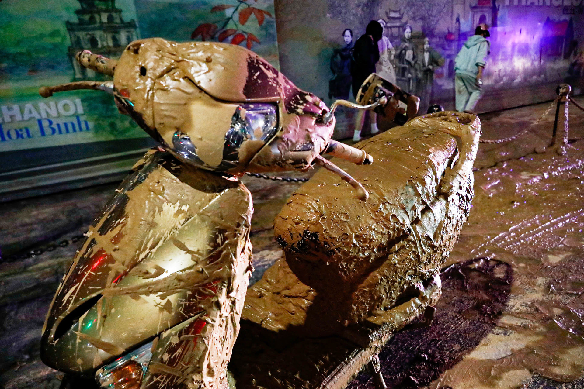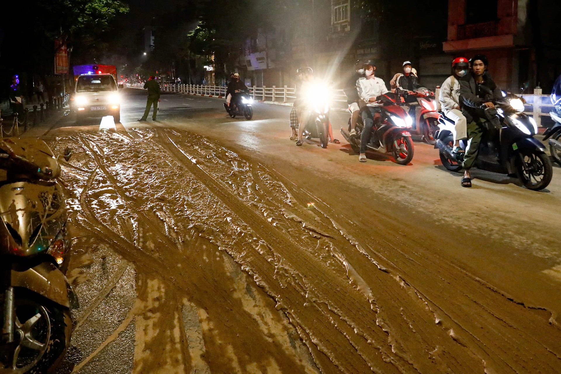 Trước đó, khuya 16/11, hàng loạt người đi xe máy ngã ra đường vì lớp bùn dày tại khu vực ngã tư Tôn Đức Thắng - Nguyễn Thái Học (phường Văn Miếu - Quốc Tử Giám).
