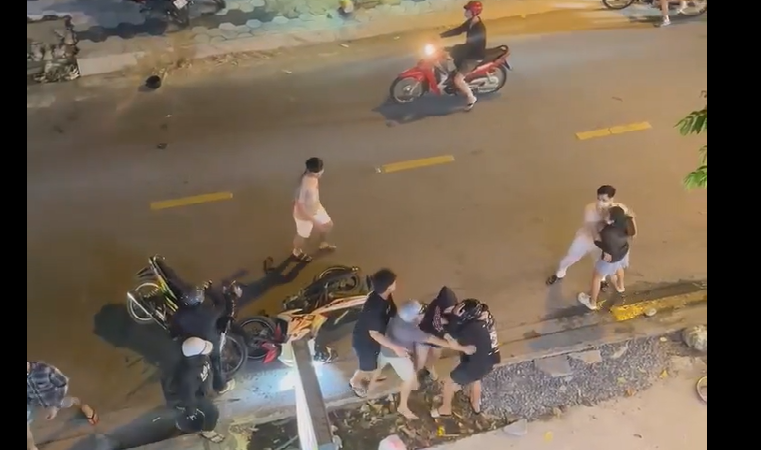 Trong đó, hai thanh niên bị nhiều người khác vây đánh. Một người trúng đòn ngã xuống đường và ôm đầu nhưng vẫn liên tục bị 3 đối tượng lao vào đấm đá. Một số đối tượng còn nhặt gạch đá ven đường đập vào đầu nạn nhân, bất chấp sự can ngăn của vài phụ nữ đứng gần đó.